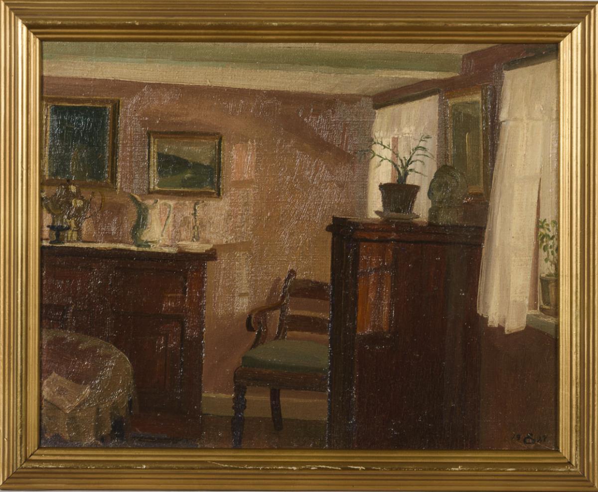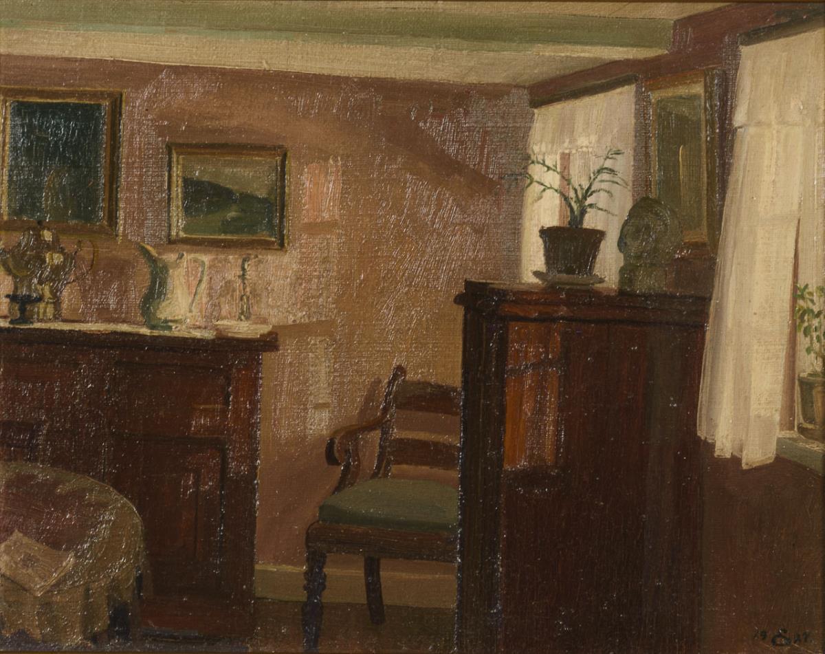 Stube mit Armlehnstuhl, Kommode und Gemälden im einfallenden Tageslicht.