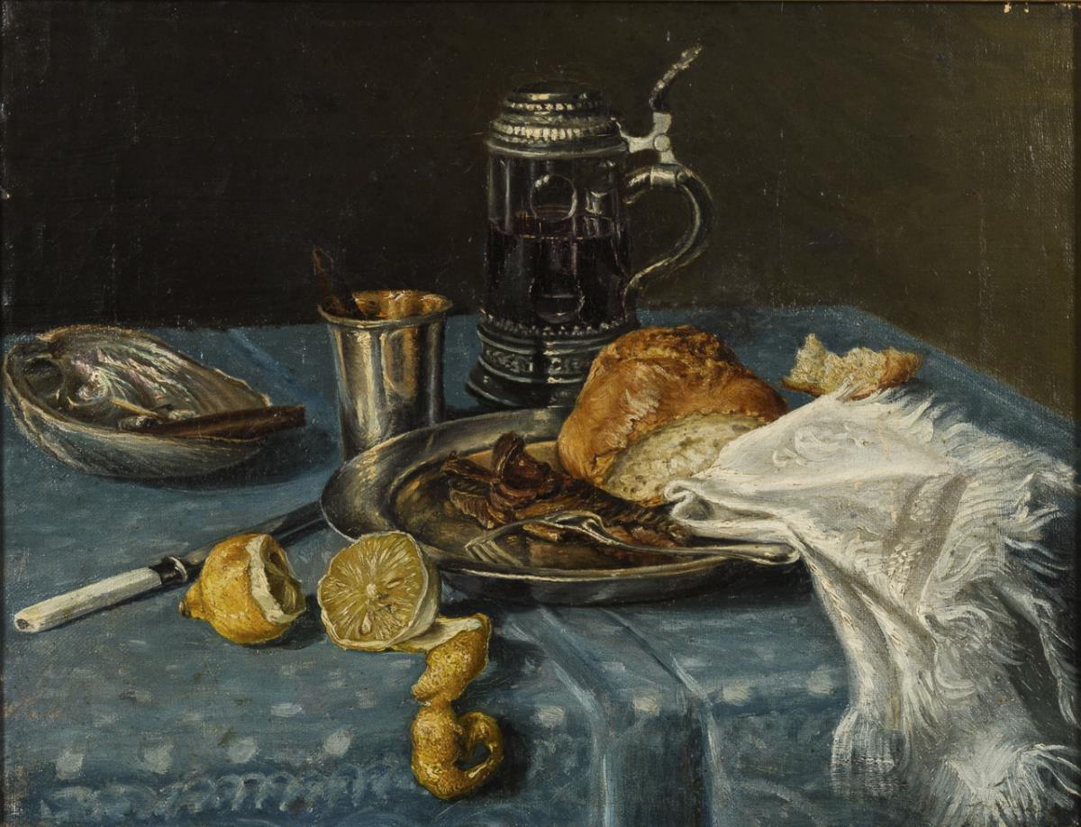 Im Stil der Alten Meister gehaltenes Stillleben mit Fisch und Semmel auf einem Teller neben geschälter Zitrone und Weinkrug. Eine kleine restaurierte Stelle mit Hinterklebung.