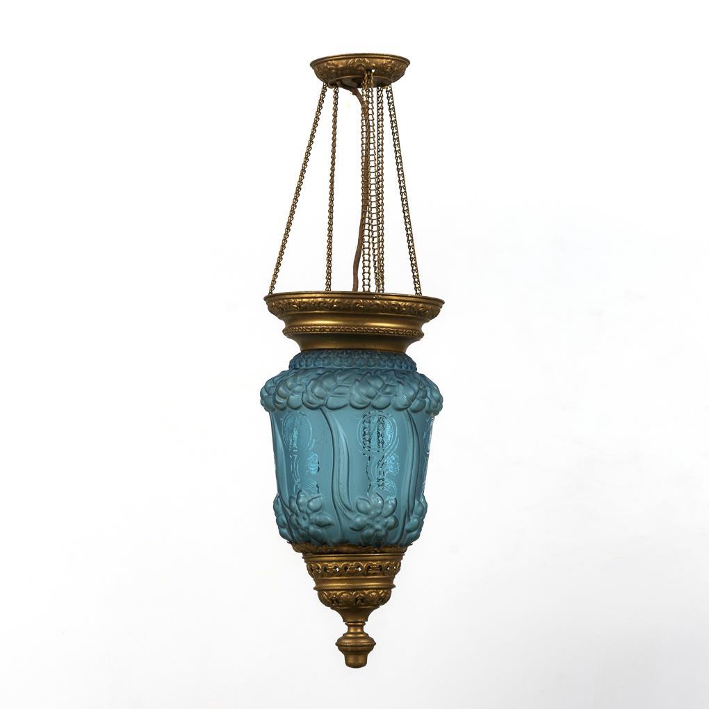 1-flammige Hängelampe mit Gestell aus Messingblech und blauem Glaskörper mit Blüten und stiltypischem Damenporträt; Kettenaufhängung an Rosettenbaldachin. Alters-/Gebrauchsspuren.