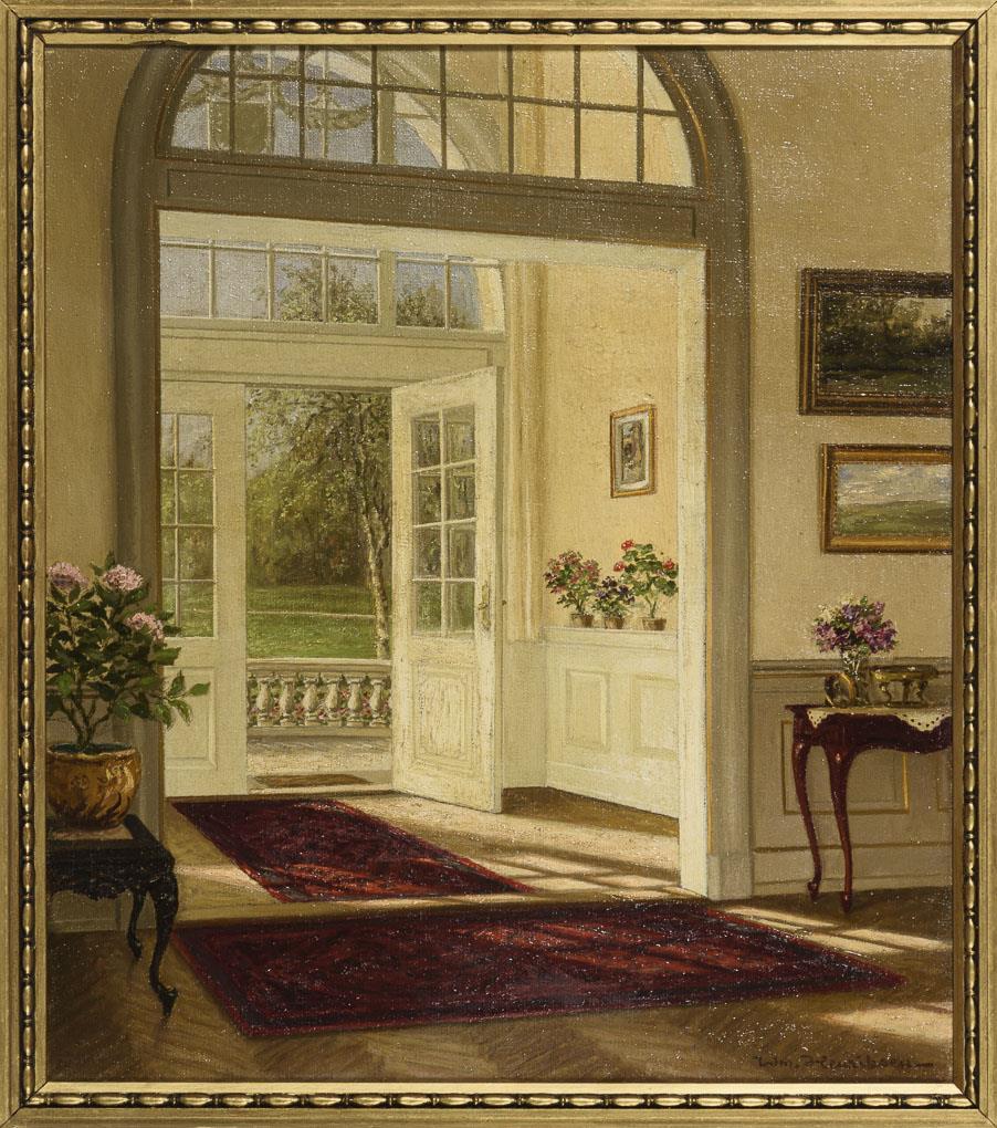 Herrschaftliches Landhausinterieur mit zum Garten geöffneter Tür und einfallendem Sonnenschein.