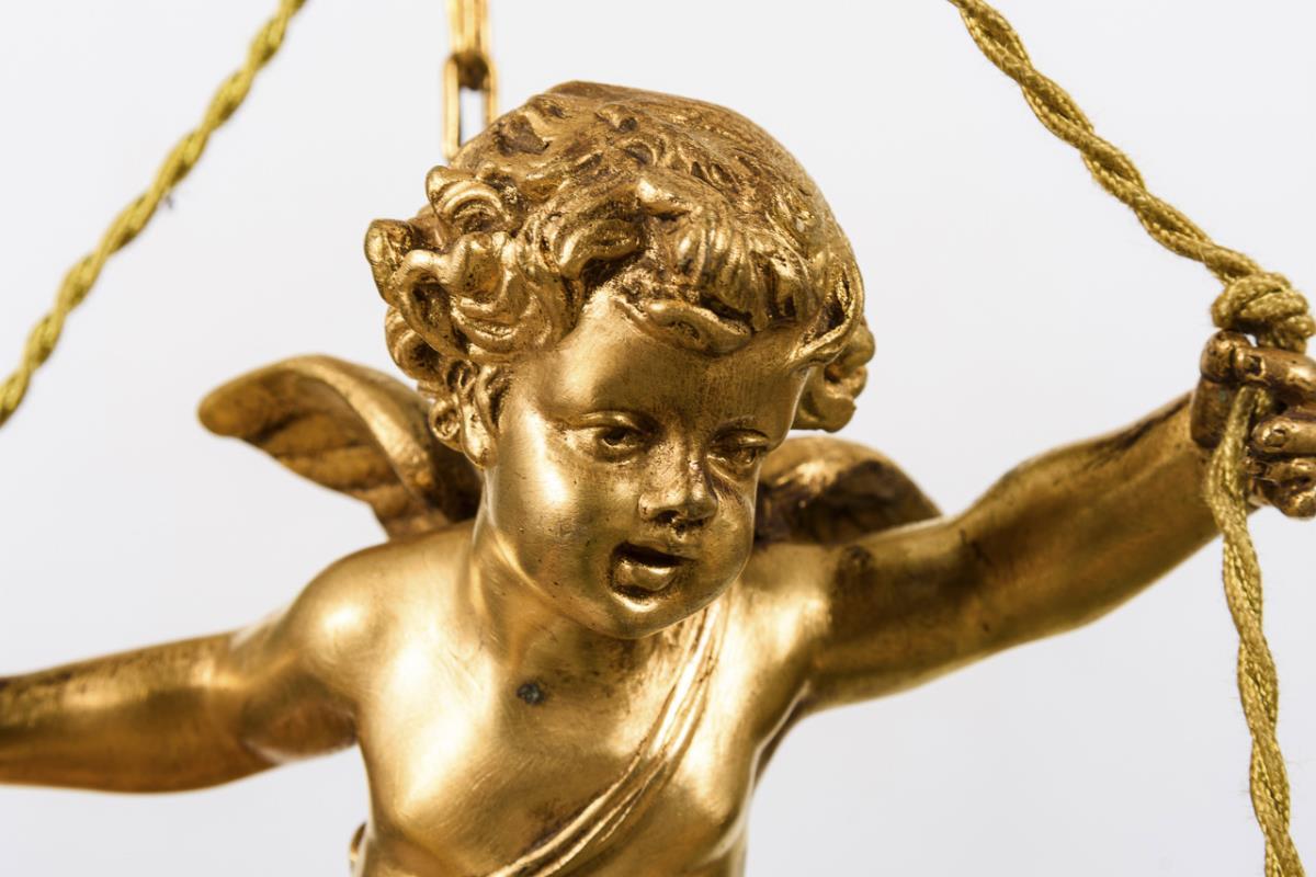 Zierliche, 2-flammige Hängelampe in Form eines schwebenden Puttos, der 2 blütenförmige Lampenfassungen mit irisierenden Tulpenschirmen hält; an Kettenaufhängung und Blüten-Baldachin. Minimale Alters-/Gebrauchsspuren.