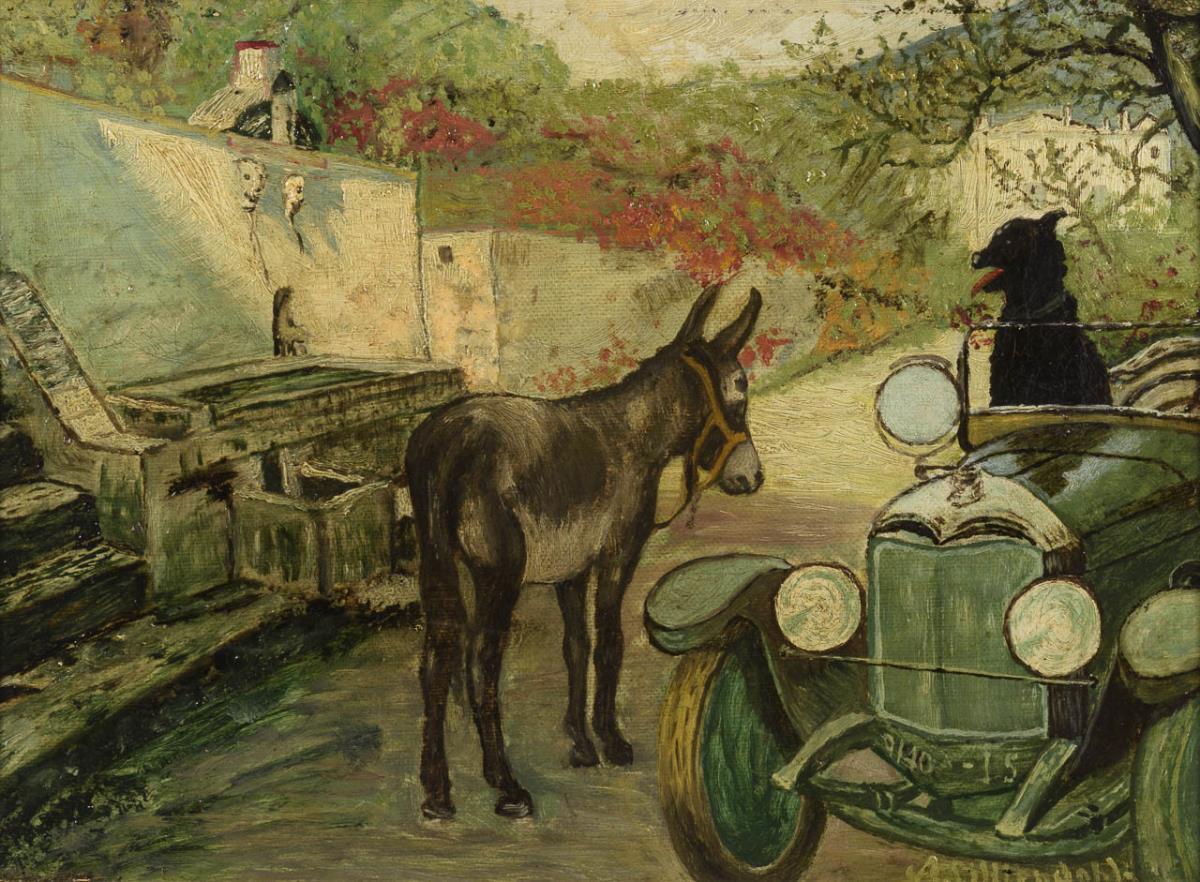 Genreszene mit Esel bei einem Automobil mit einem Hund. Eine kleine restaurierte Stelle mit Hinterklebungen.