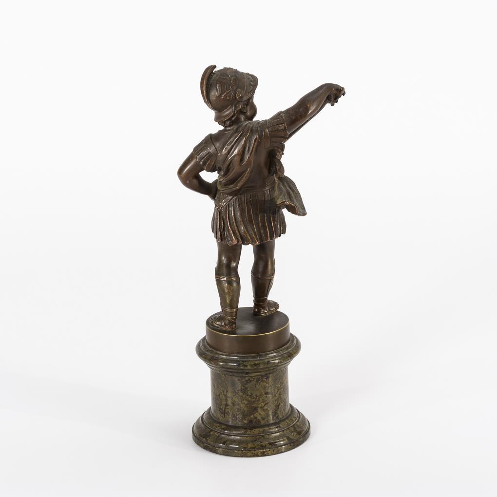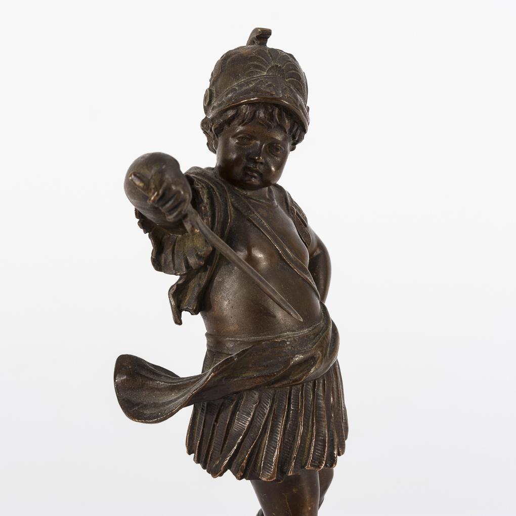 Wohl der kindliche Kriegsgott Mars, der sein Schwert beschaut. Schwert gering verbogen und mit minimalem Haarriss, sonst kaum Alters-/Gebrauchsspuren.