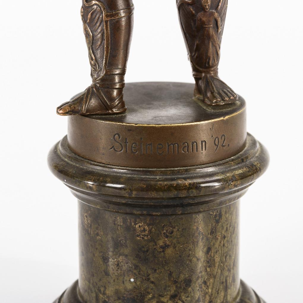 Bronze patiniert, Serpentin-Sockel. Bezeichnet mit Datum (18)92. H 19 / 25,5 cm.