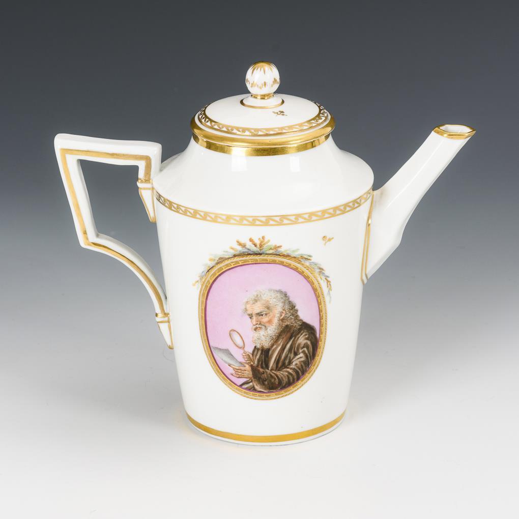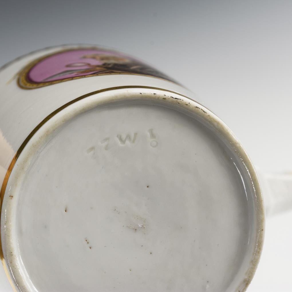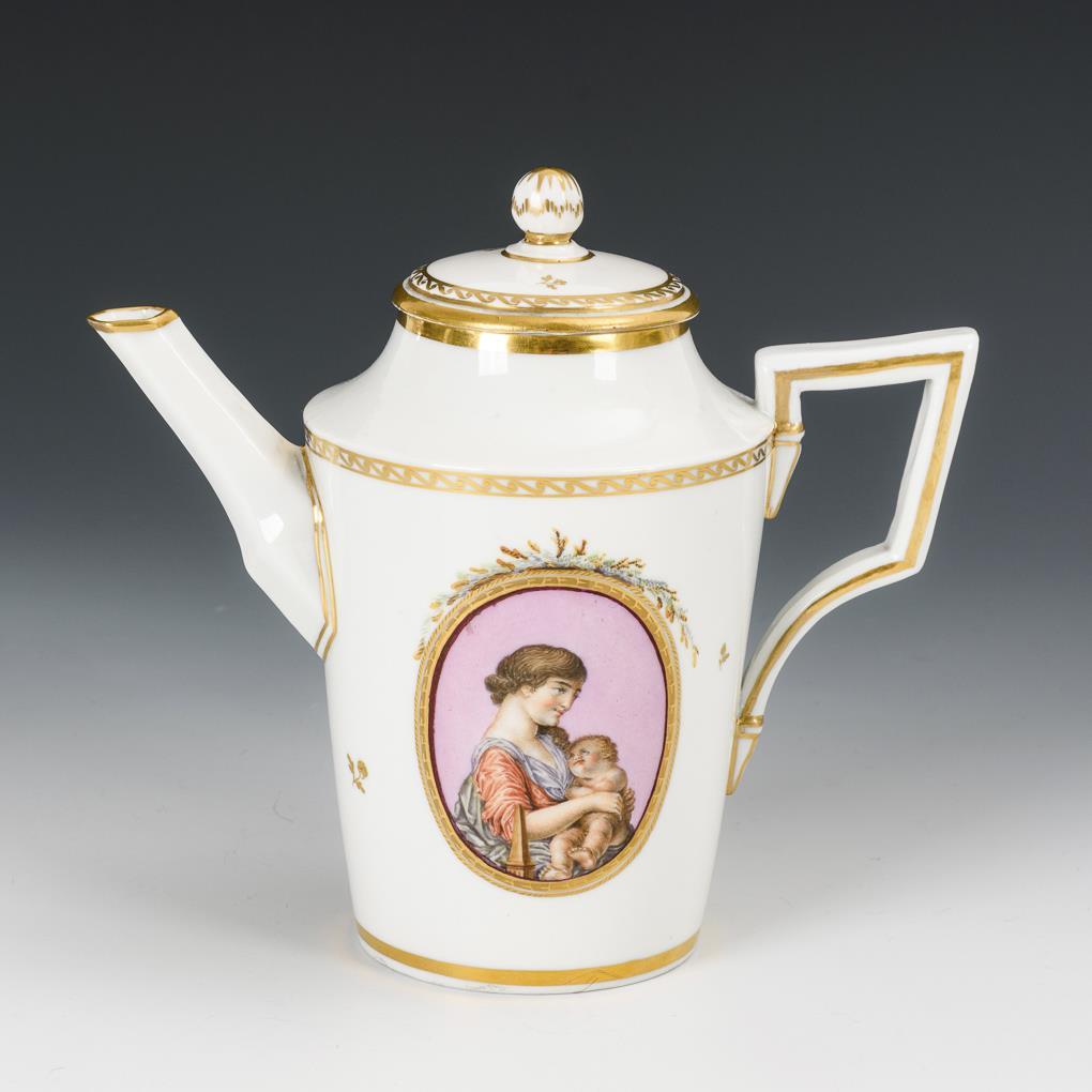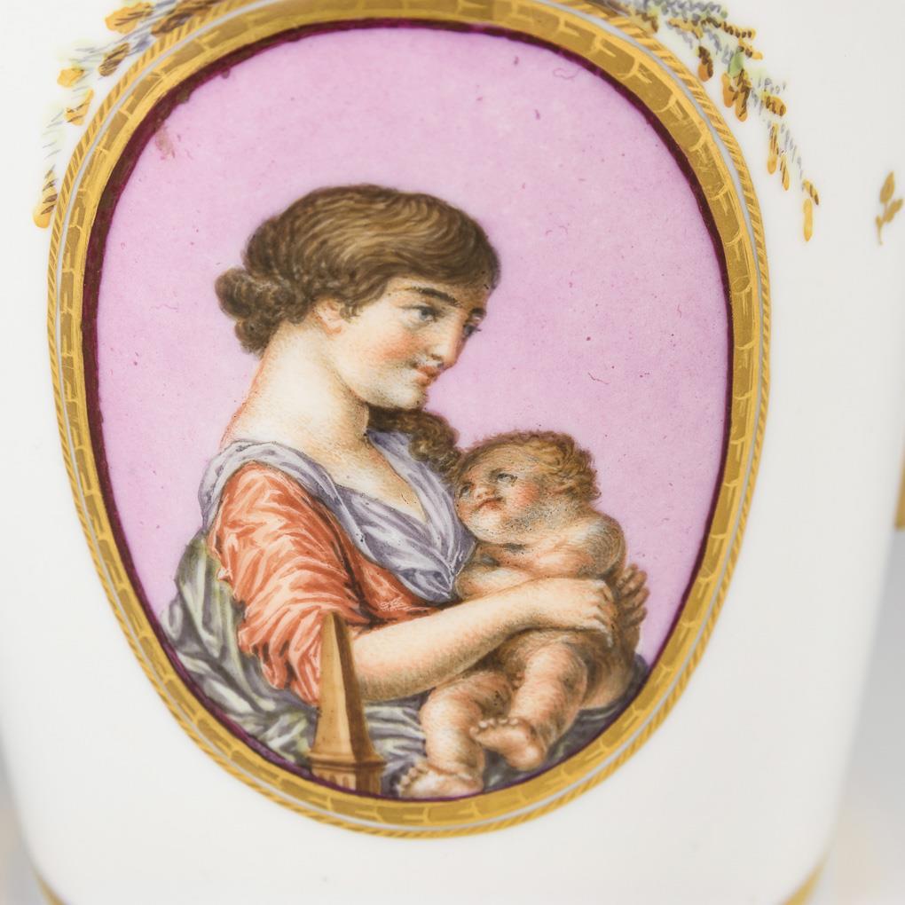 Konische Form mit spitz gewinkeltem Henkel. Beidseitig ein ovales Medaillon mit rosa Fond sowie der Darstellung eines brieflesenden Mannes bzw. einer jungen Frau mit Kind. Henkel restauriert.