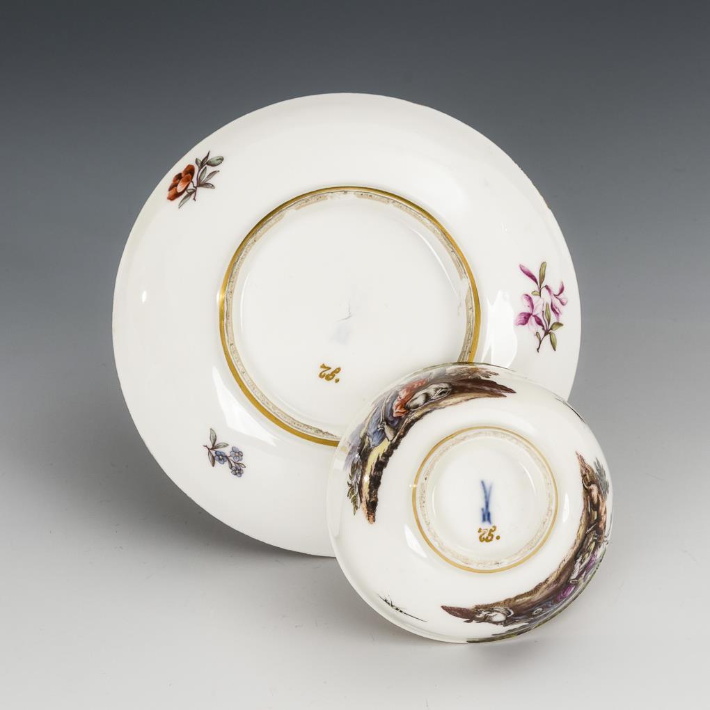 Tasse und Untertasse mit Jagdmotiv und Baumotiv. Meissen.