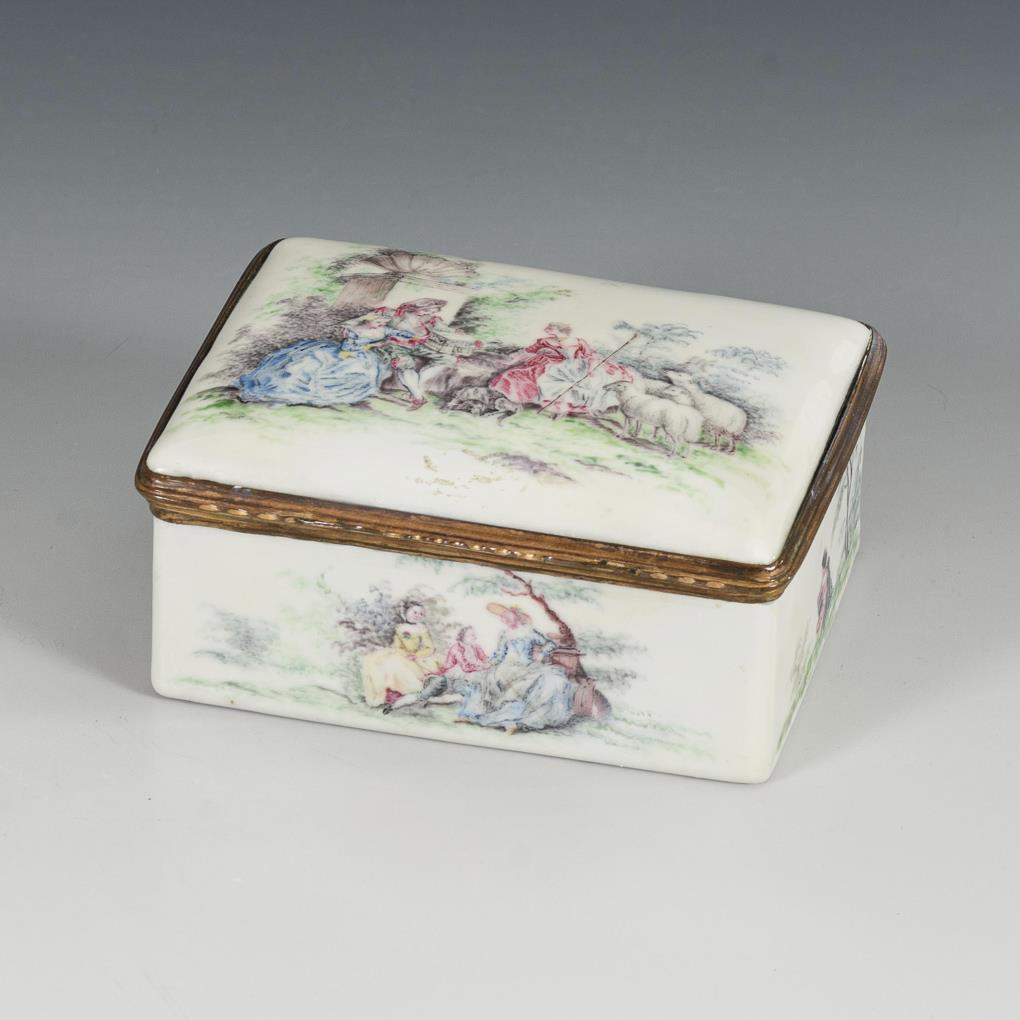 Quaderdose allseits mit Figuren in Landschaften bemalt; auf dem Boden nur eine Landschaft. Auf dem Scharnierdeckel galante Szene mit Schäferin im Park; im Deckel bacchantisches Gelage mit zentraler Nymphe.