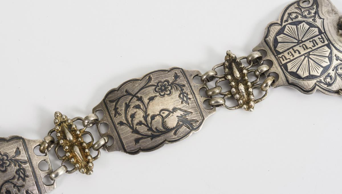 9 verzierte Gürtelglieder, Schnalle mit arabischer Schrift und Dolch als Schließe. Leichte Altersspuren.