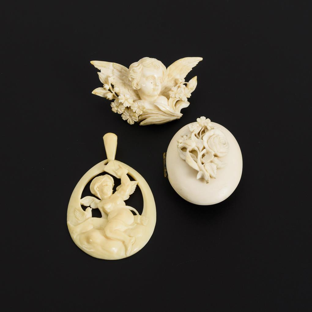 Rosenverziertes (kleine Blüte bestoßen) Medaillon mit gerahmt verglastem Innenfach. Öse fehlt. Rahmenanhänger und Brosche mit geschnitzten Engelmotiven. Hakenverschluss.