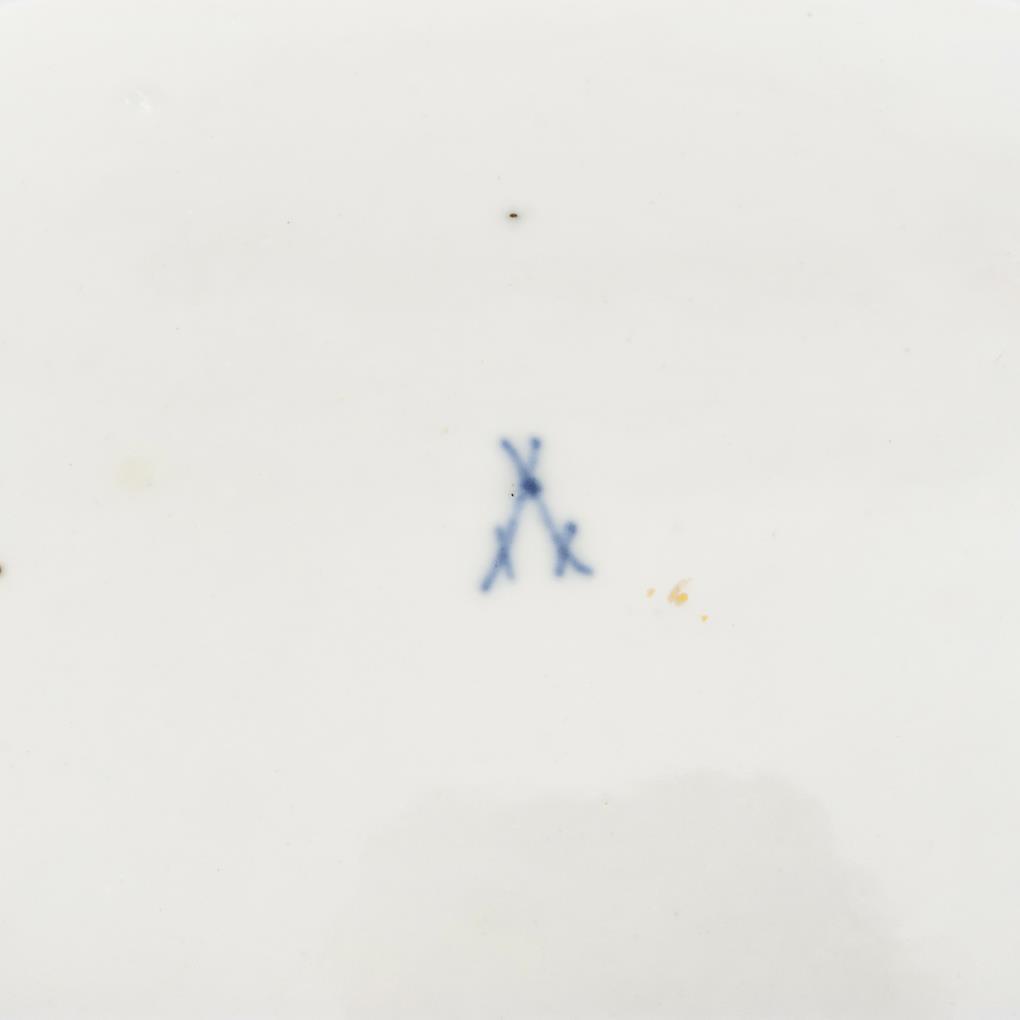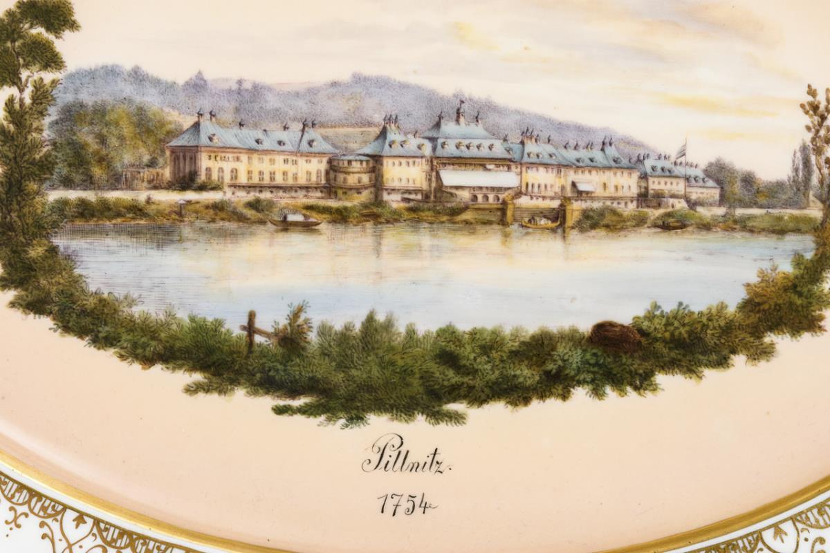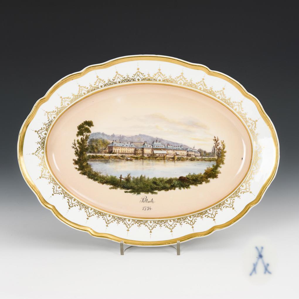 Ovale Platte mit passig geschweiftem Rand. Im Spiegel die bezeichnete Ansicht des Schlosses Pillnitz von 1754. Kleine Glasurfehlstelle am Rand.