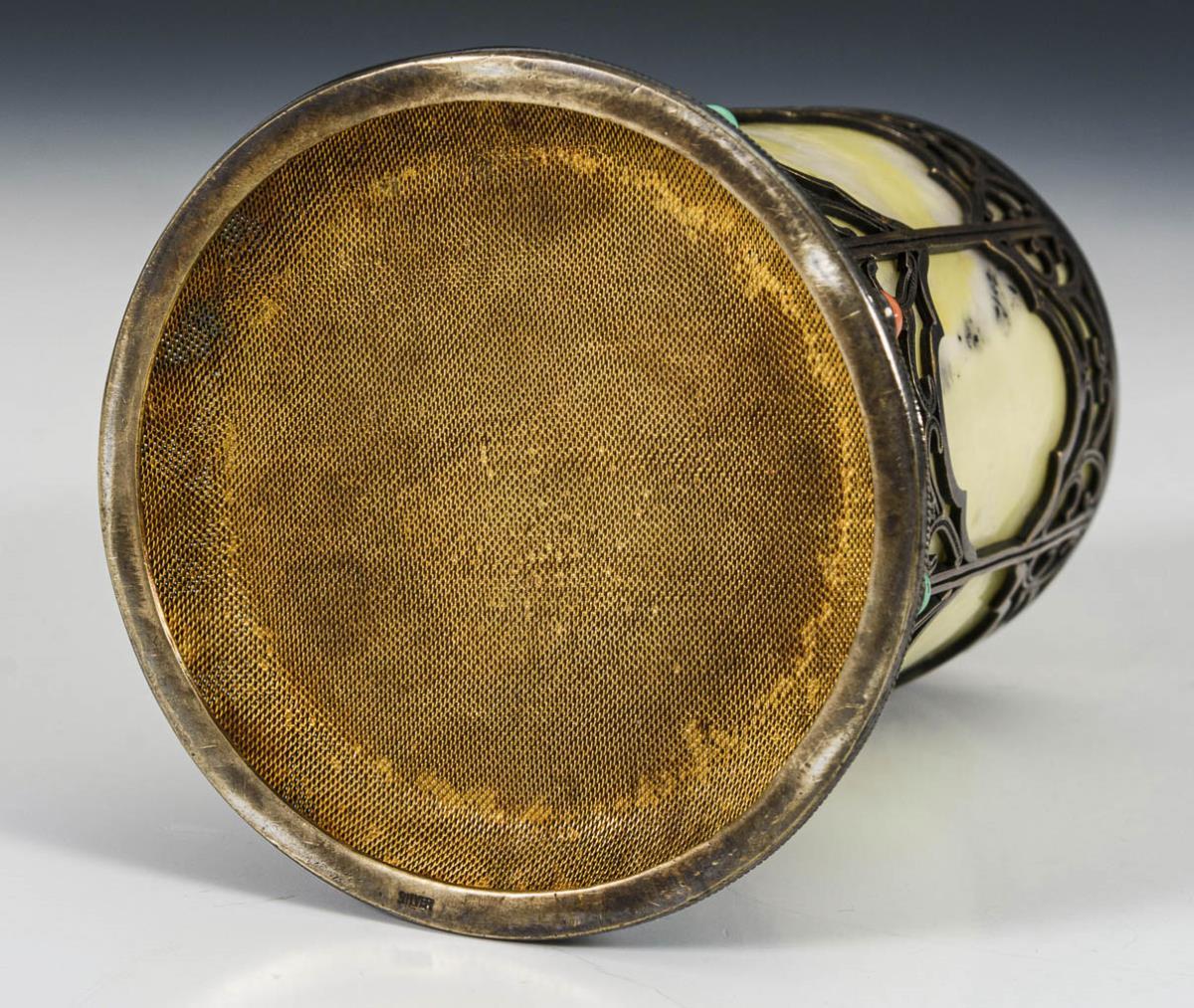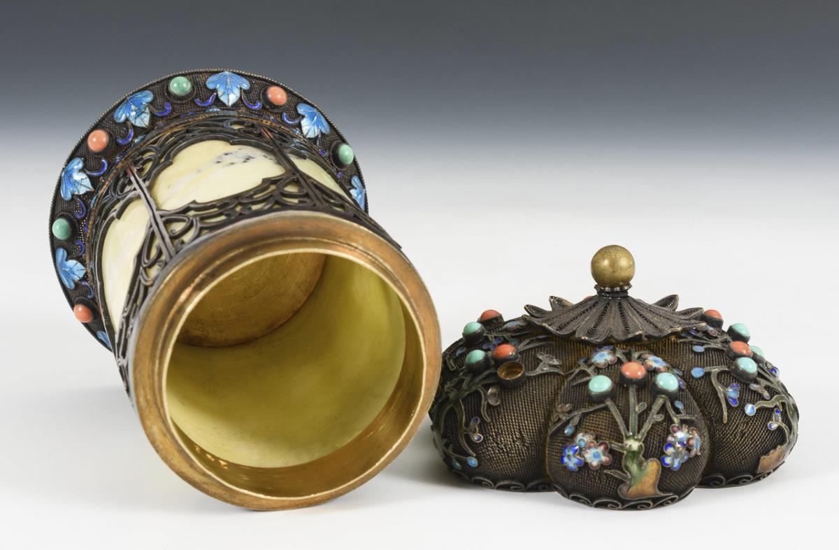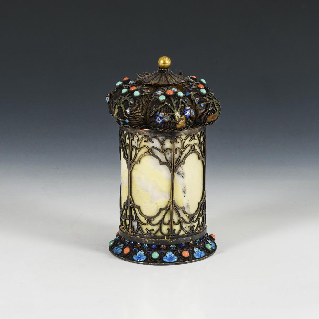 Zylindrischer Korpus aus weißlicher Jade, gefasst in filigraner Silbermontierung, mit Koralle, Email und Türkis verziert. Ein Türkis fehlt, leichte Gebrauchsspuren.