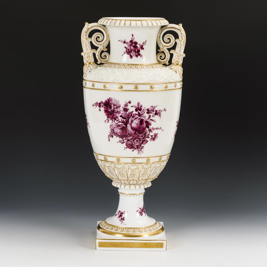 Ovoider Korpus mit vegetabil reliefierter Biskuitschulter, zwei Akanthusblatthenkeln, Rundfuß und Quadratplinthe. Beidseitig ein Blumenbukett.