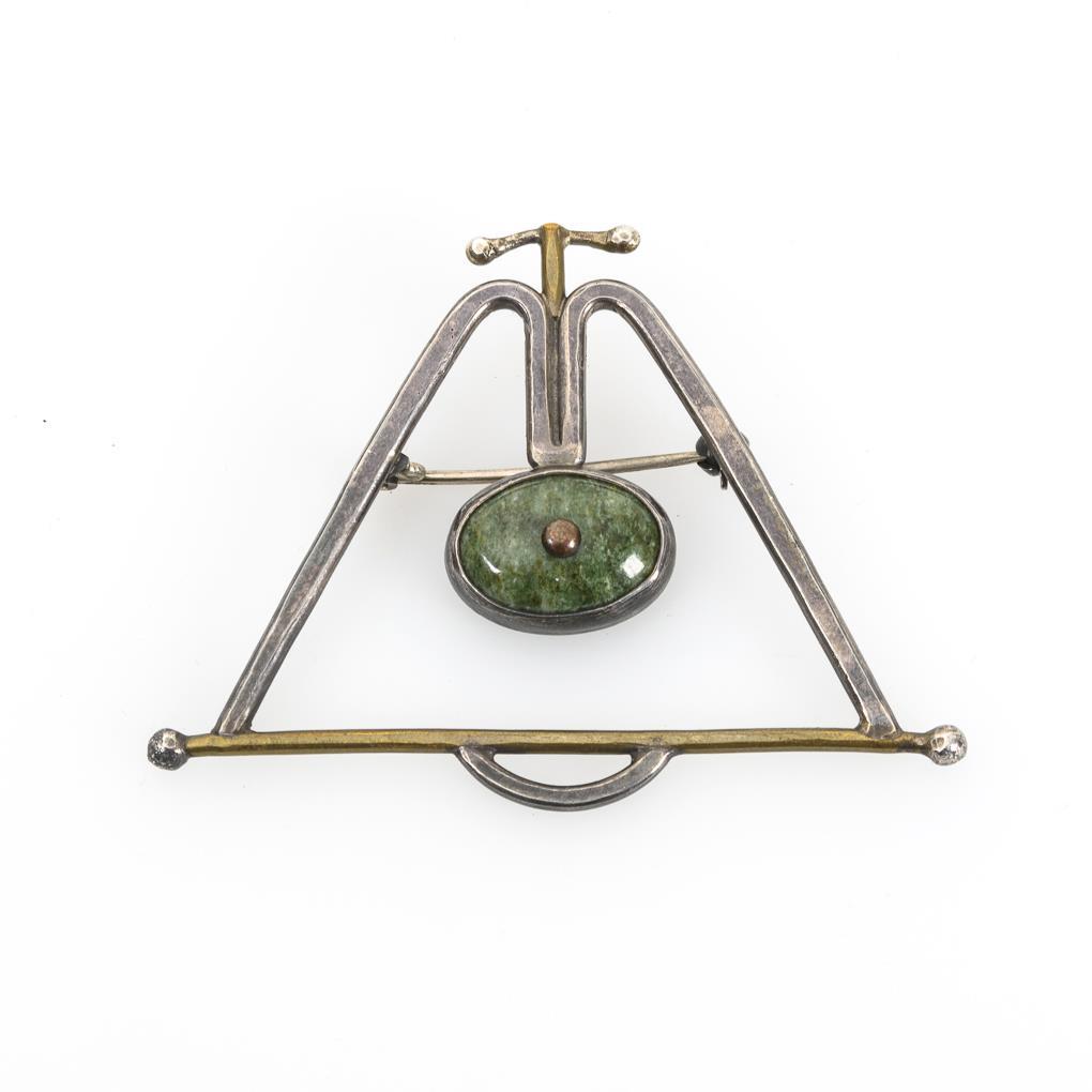 Geometrisch gearbeitete Brosche mit gefasstem Cabochon. Kugelhaken.