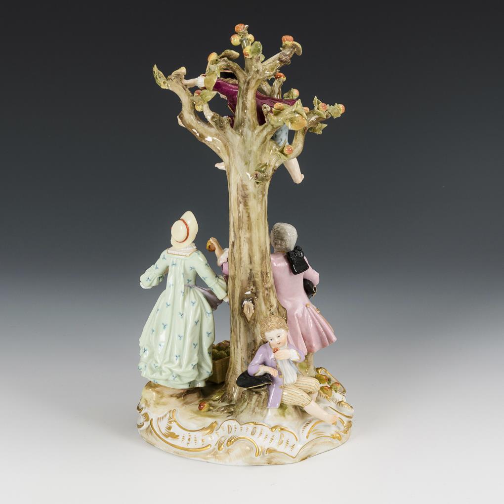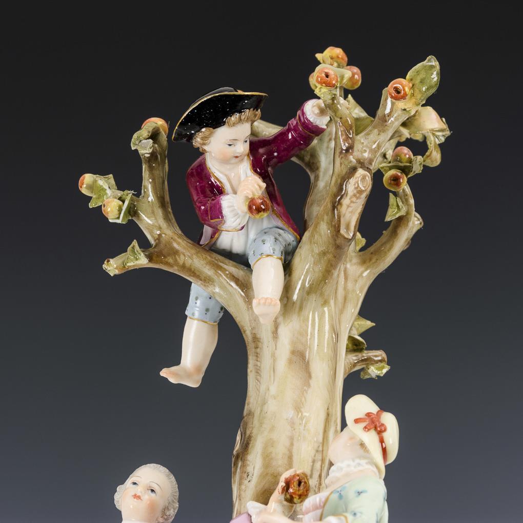 Galantes Paar mit Apfelkorb unter einem Apfelbaum, im Baum ein äpfelpflückender Knabe sitzend. Restauriert, Blätter überwiegend defekt und farbretuschiert.