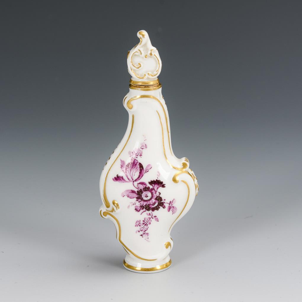 Flakon in Rocailleform. Schauseitig das fein gemalte Porträt eines Herren mit Pfeife, verso ein purpurfarbenes Blumenbukett. Minimaler Goldabrieb.
