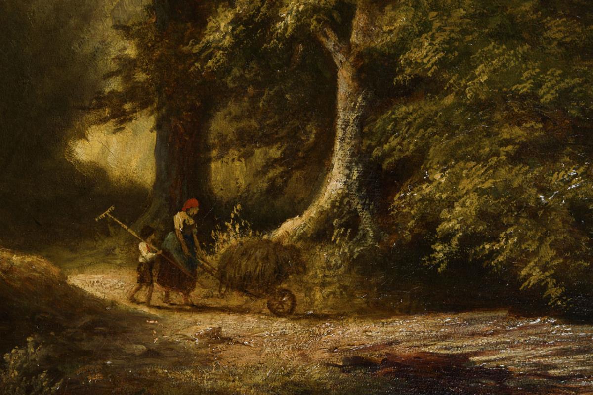 Mutter und Kind mit beladenem Heukarren auf dem Heimweg am Waldrand. Leichte Altersspuren.