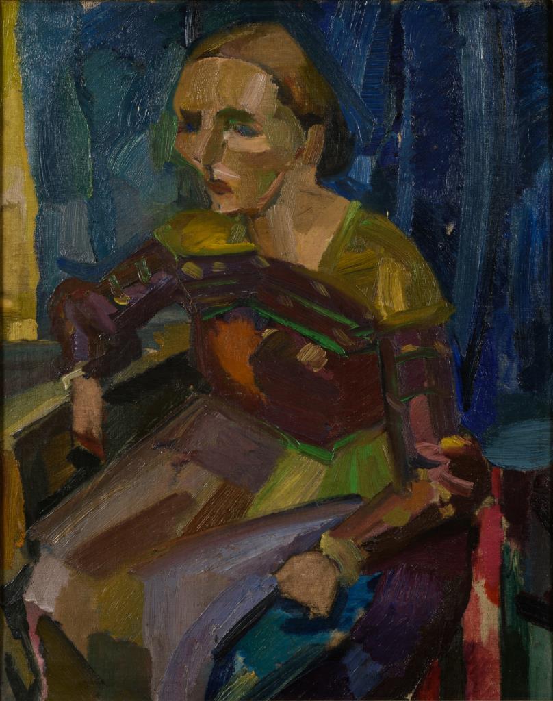 Bildnis einer Frau in vielfarbigem Kleid vor blauem Hintergrund. Altersspuren.
