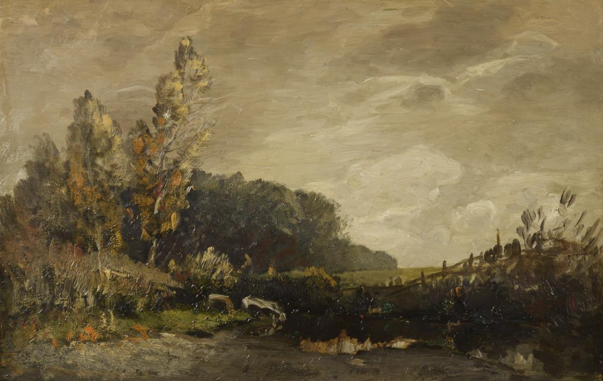 Herbstliche Landschaft mit Gewässer nahe einem Wald unter grauem Himmel.