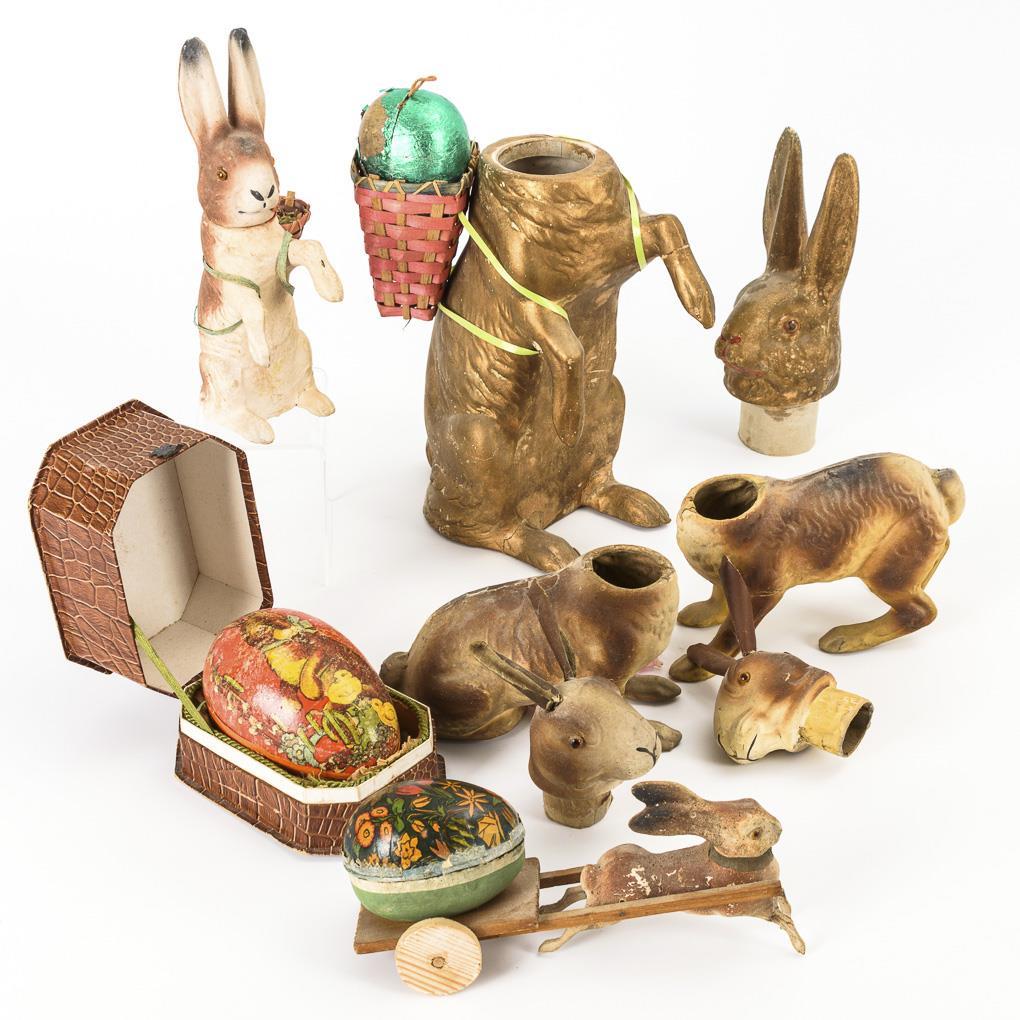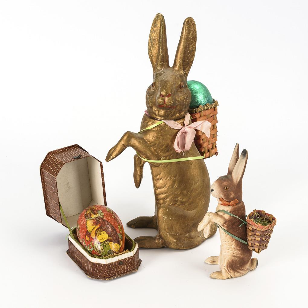 1 großer, goldbronzierter Hase, 3 verschiedene, kleinere Hasen mit abnehmbaren Köpfen, 1x laufend mit Wagen und Füllei. Altersspuren, teils mit Defekten.