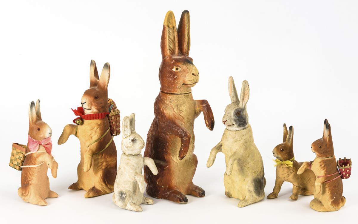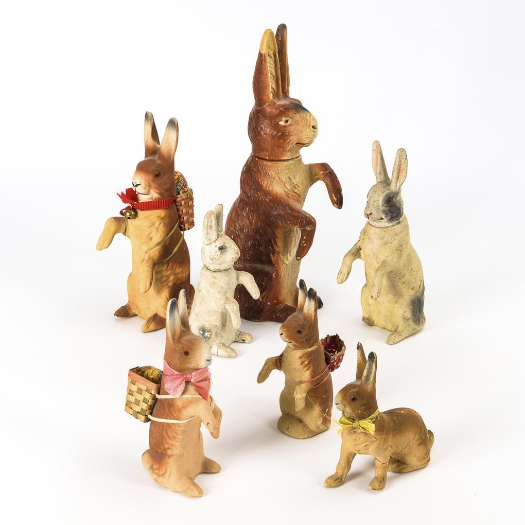 Verschiedene Hasen mit abnehmbaren Köpfen, 3x mit Körbchen. Teils kleine Defekte und Reparaturen.
