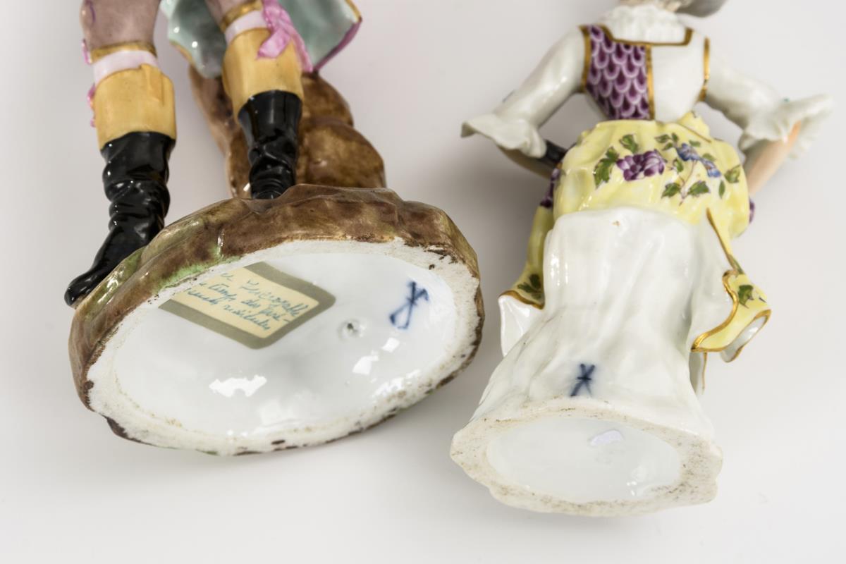 Auf einem Baumstumpf sitzende, eine Drehleier spielende Dame (H 12 cm). / Stehender, eine Schachfigur zeigender Rokokoherr. Hut der Dame restauriert.