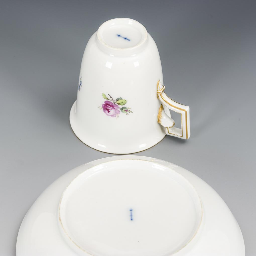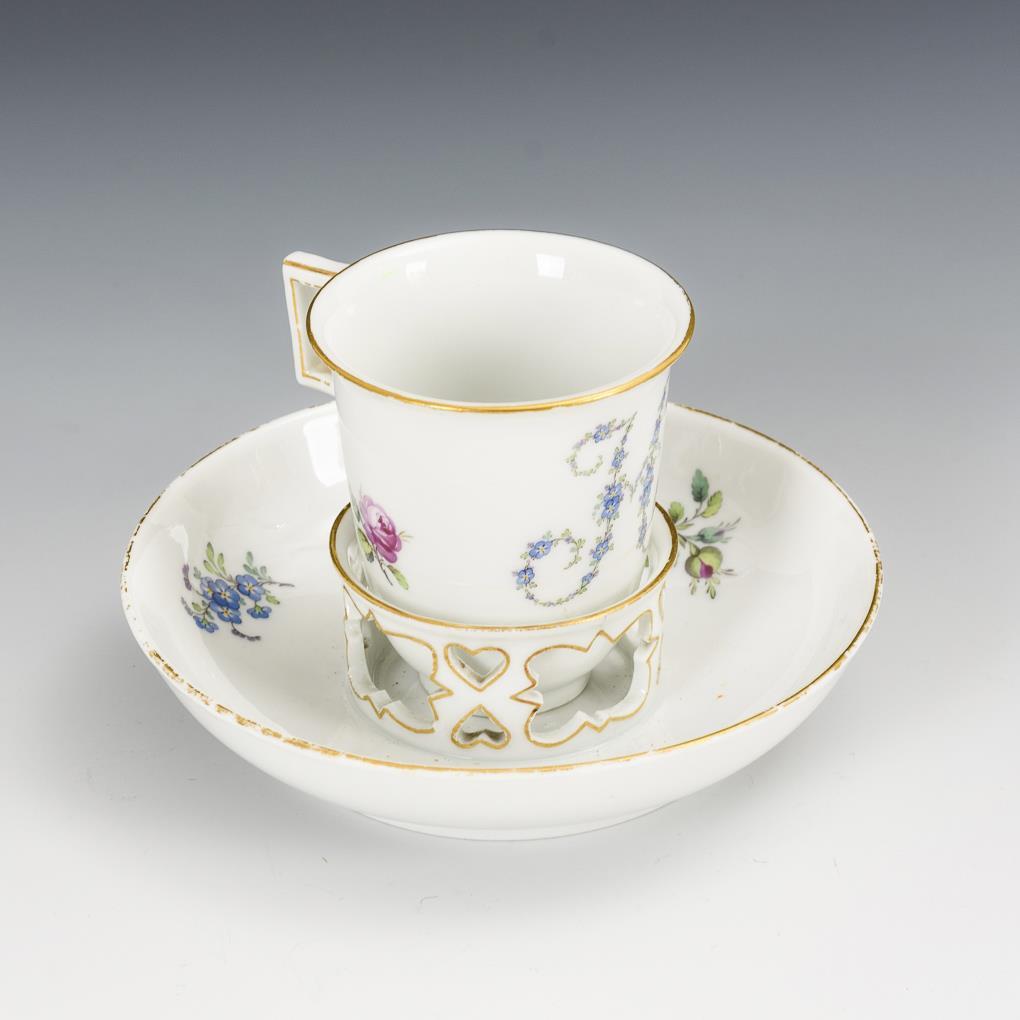 Glockentasse mit gewinkeltem Henkel und Untertasse mit erhöhtem, durchbrochenem Standring. Mit Blumenmalerei, schauseitig auf der Tasse die aus Vergißmeinnichtblüten gestaltete Initiale "H". Minimaler Goldabrieb.