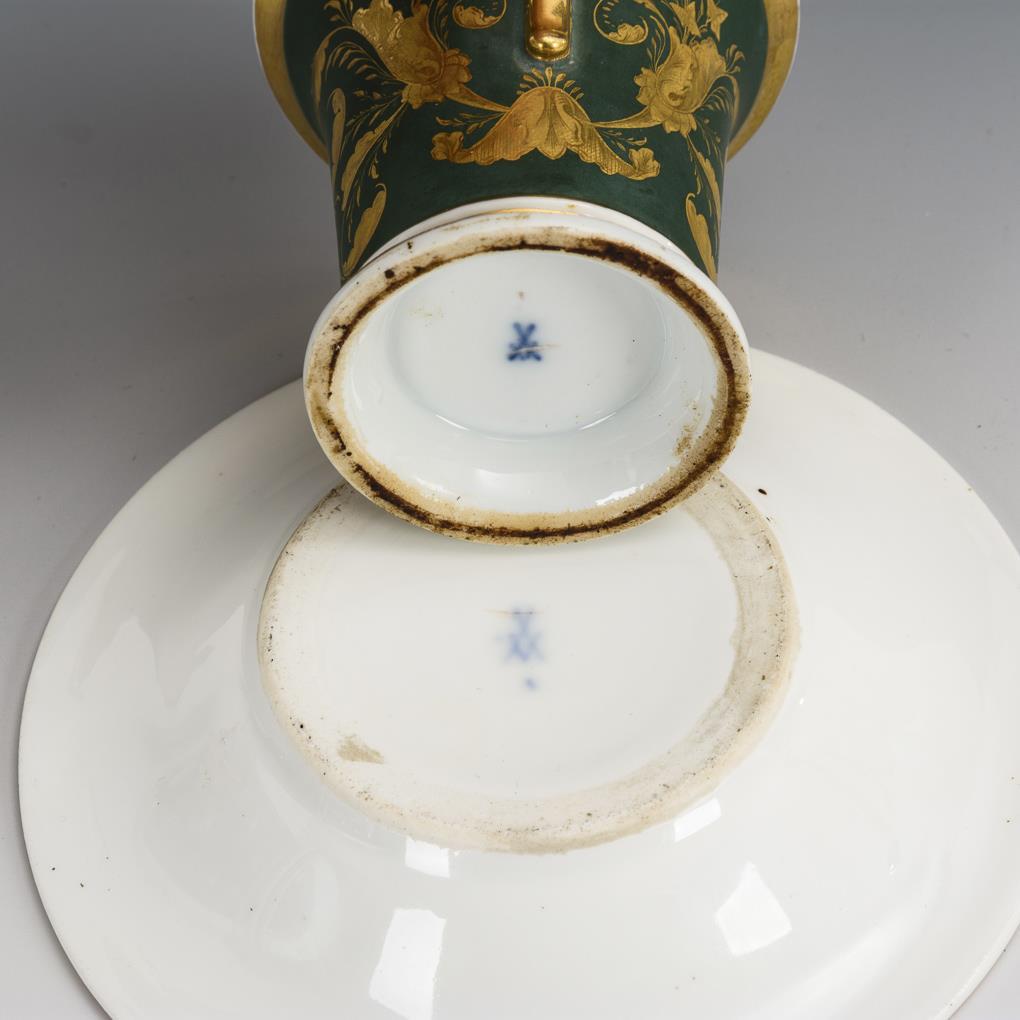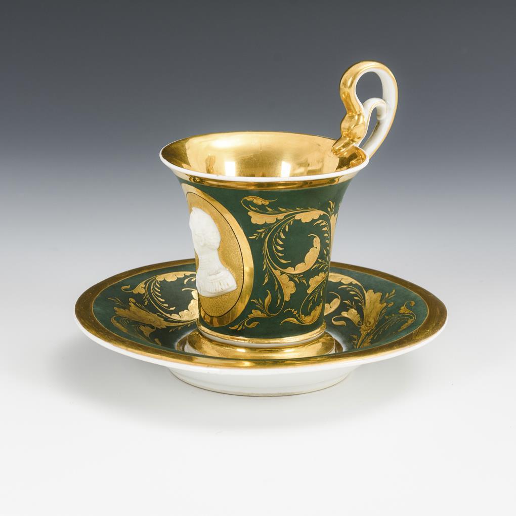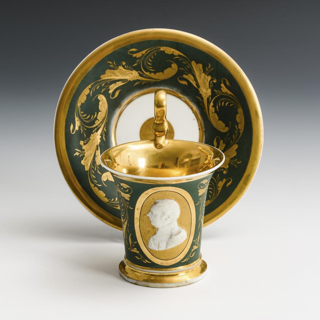 Kratertasse mit Schwanenhenkel. Dunkelgrüner Powderfond mit goldradierten Blattbändern, schauseitig eine goldgerahmte Kartusche, darin vor einem Goldfond mit Wurmliniendekor ein Biskuitreliefporträt, wohl König Friedrich August II. von Sachsen (1797-1854). 2 minimale Brandrisse im Biskuitrelief.
