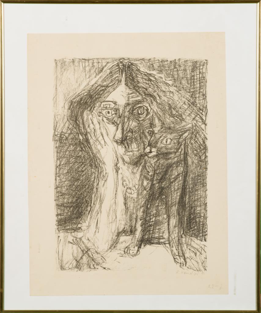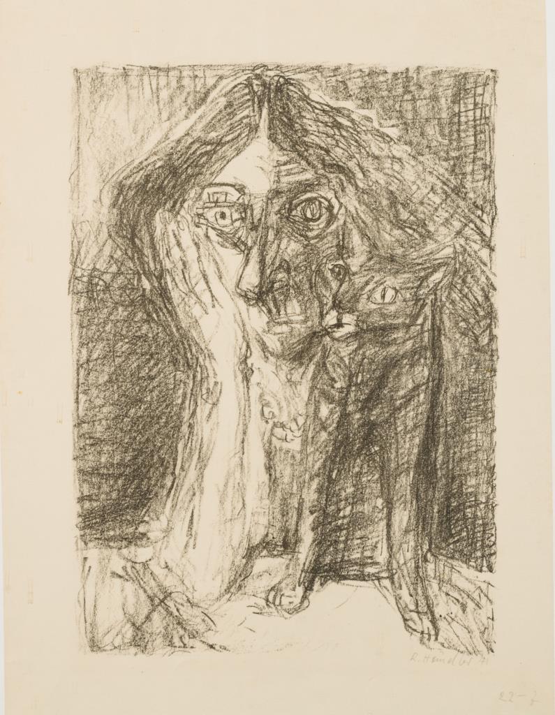 Sich auf die Hand aufstützende abstrahierte Dame neben einer Katze.