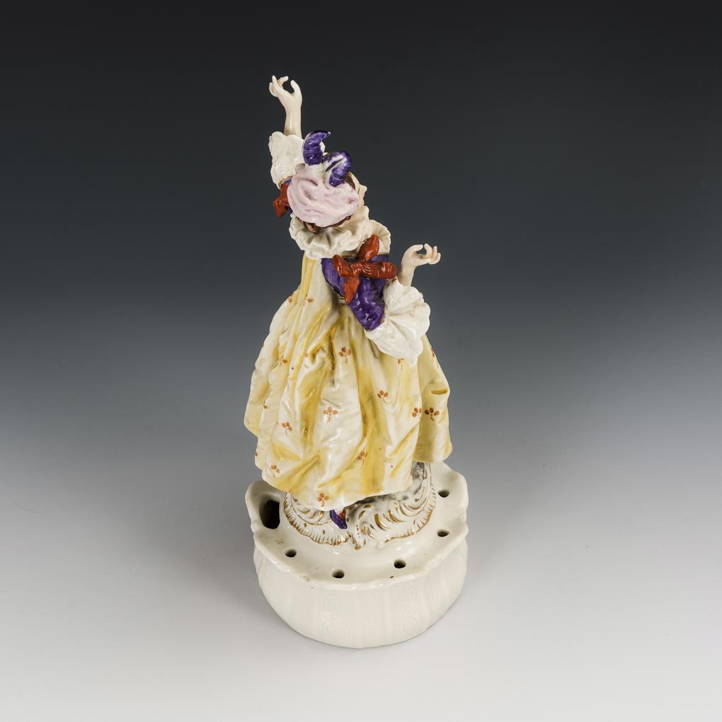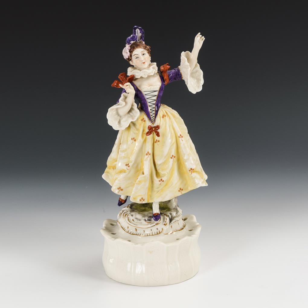 Runde Steckschale, darauf die Figur einer Rokokotänzerin.