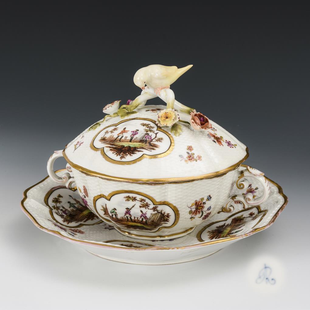 Mehrpassige Form mit Korbrelief, Terrine mit zwei Handhaben und Vogelknaufdeckel. Mit goldgerahmten Vierpassmedaillons, darin verschiedene Soldatenszenen. Minimaler Goldabrieb, Restaurierung am Deckelrand, Schwanz des Vogels restauriert.