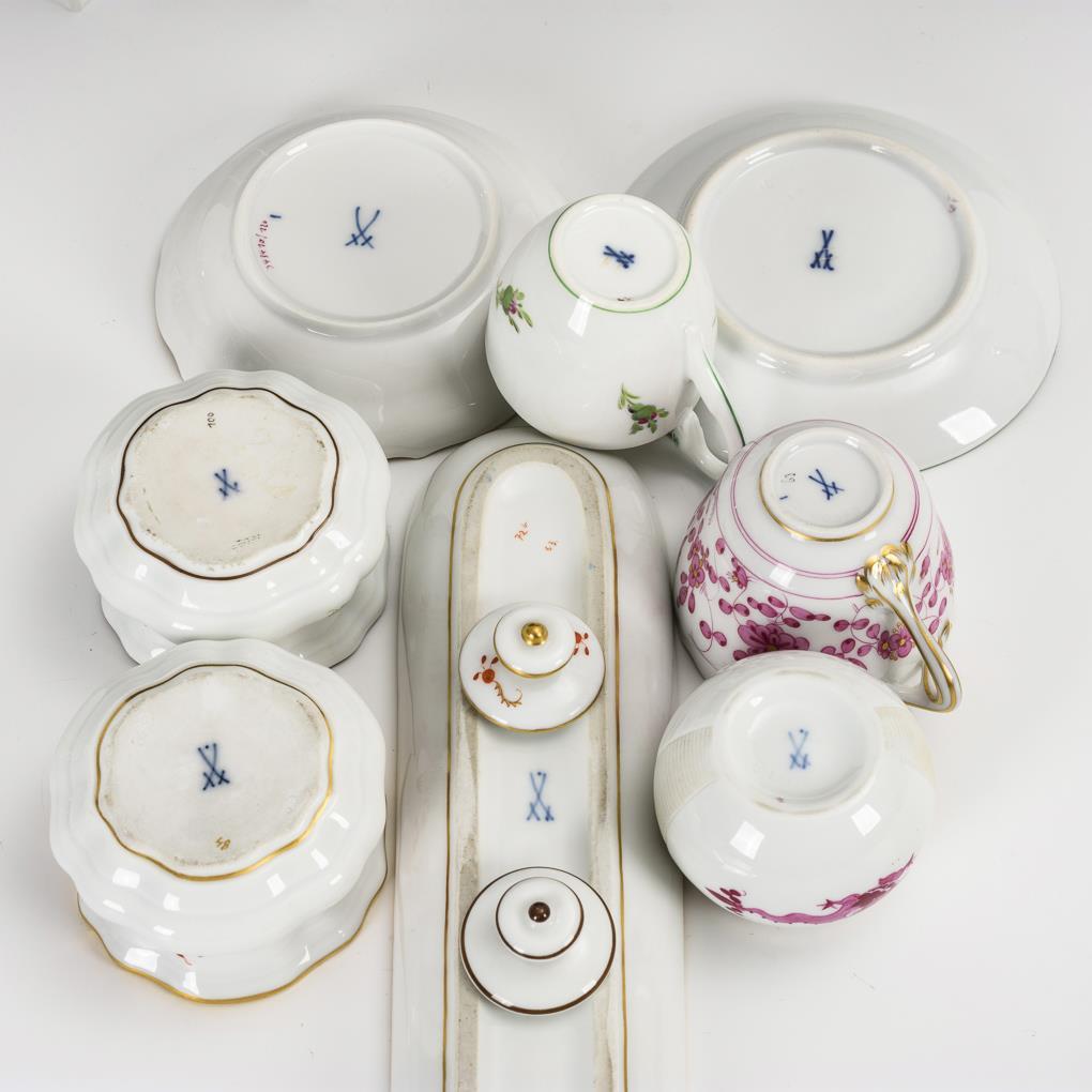 Stiftschale, 2 Tintenfässer, 2 Mokkatassen und 1 Ascher. Meissen.