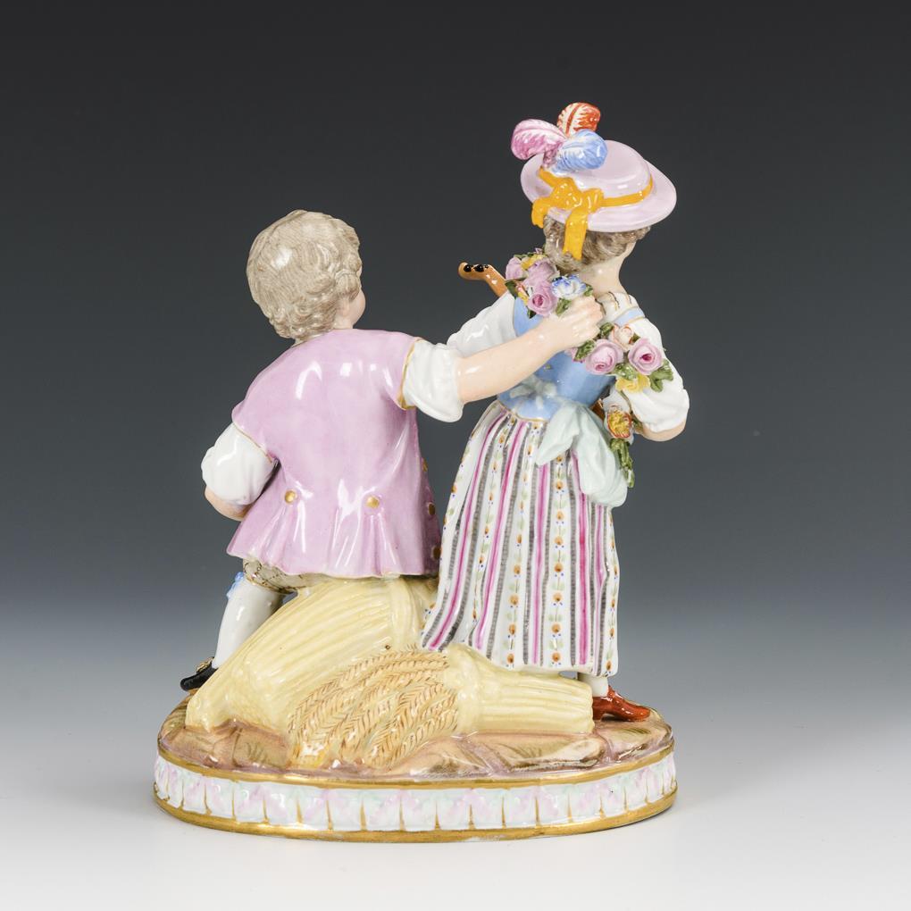 Kinderpaar mit Garbe, Mandoline und Sichel. 2 kleine Brandrisse unterseitig im Sockel, restauriert.