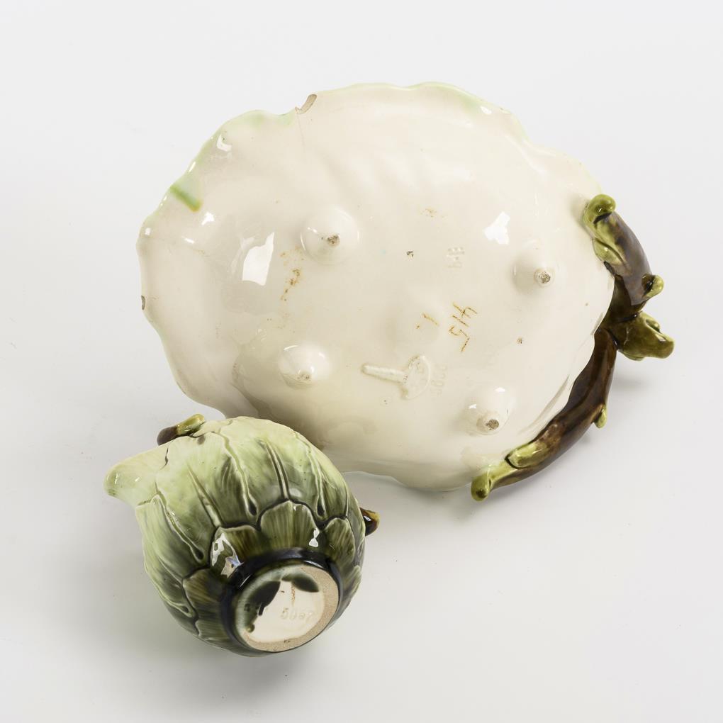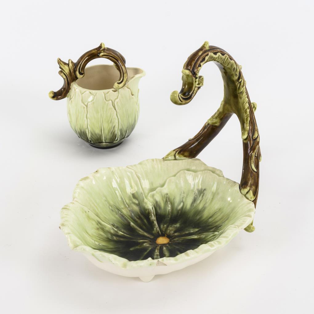Reliefierte Blütenschale mit Asthenkel (H 18,5 cm, L 21,5 cm). Bauchiges Milchkännchen (H 11 cm). Partiell bestoßen, Schalenrand mit Haarriss, Henkel geklebt.