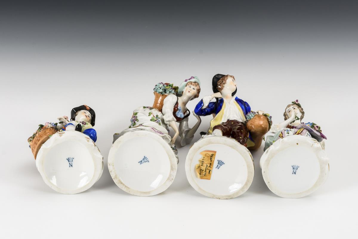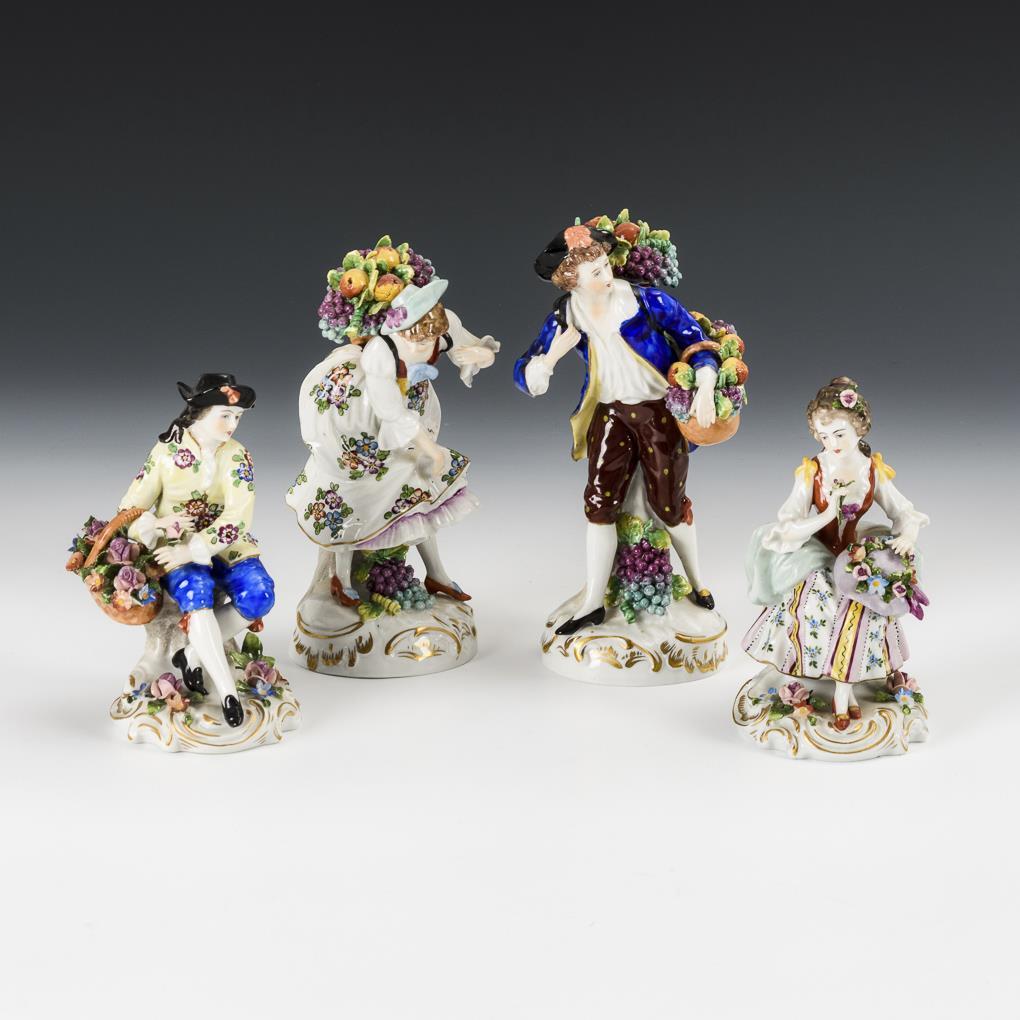 2 Gärtner mit Früchten (H 18 und 19 cm). / 2 sitzende Gärtner mit Blumenkorb bzw. Rosenblüten (14 cm). 2 Blätter bestoßen.
