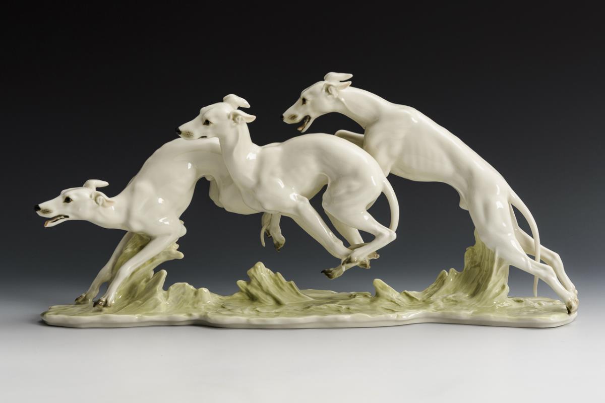 Plastik dreier hintereinander angeordneter Windhunde im Lauf.