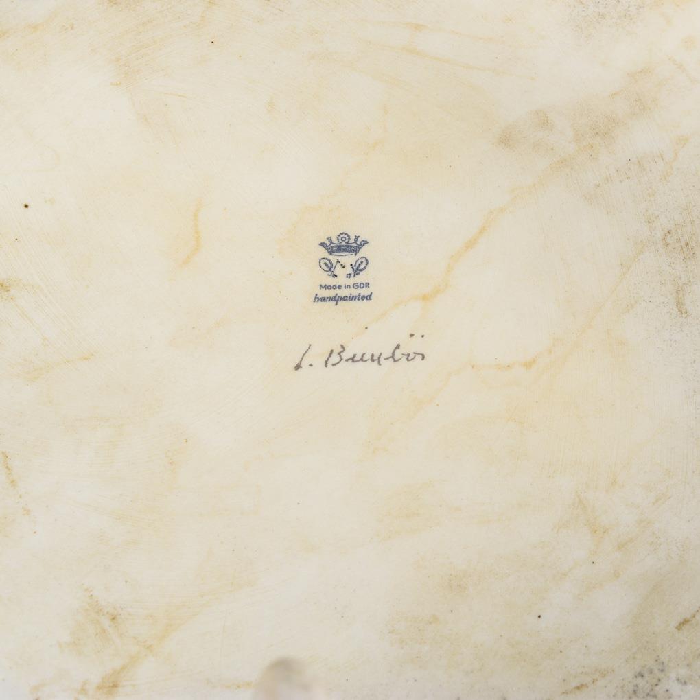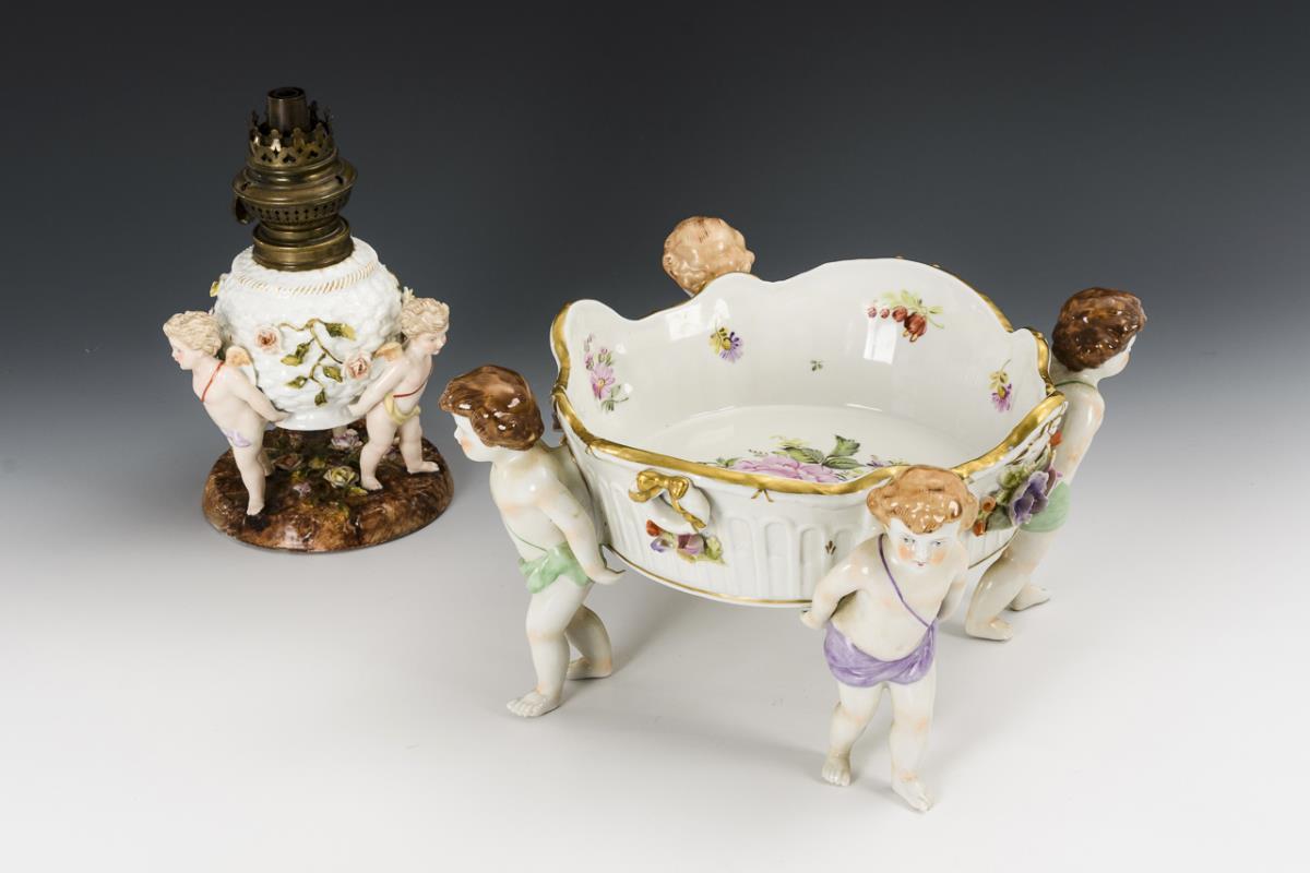 Von vier Putten getragene Schale mit Blütenbelag (H 16,5 cm, Ø 32,5 cm). / 3 einen Korb als Petroleumtank tragende Putten, mit Metallmontierung (H 22 cm, ohne Schirm und Glaszylinder). Partiell Bestoßungen am Belag.