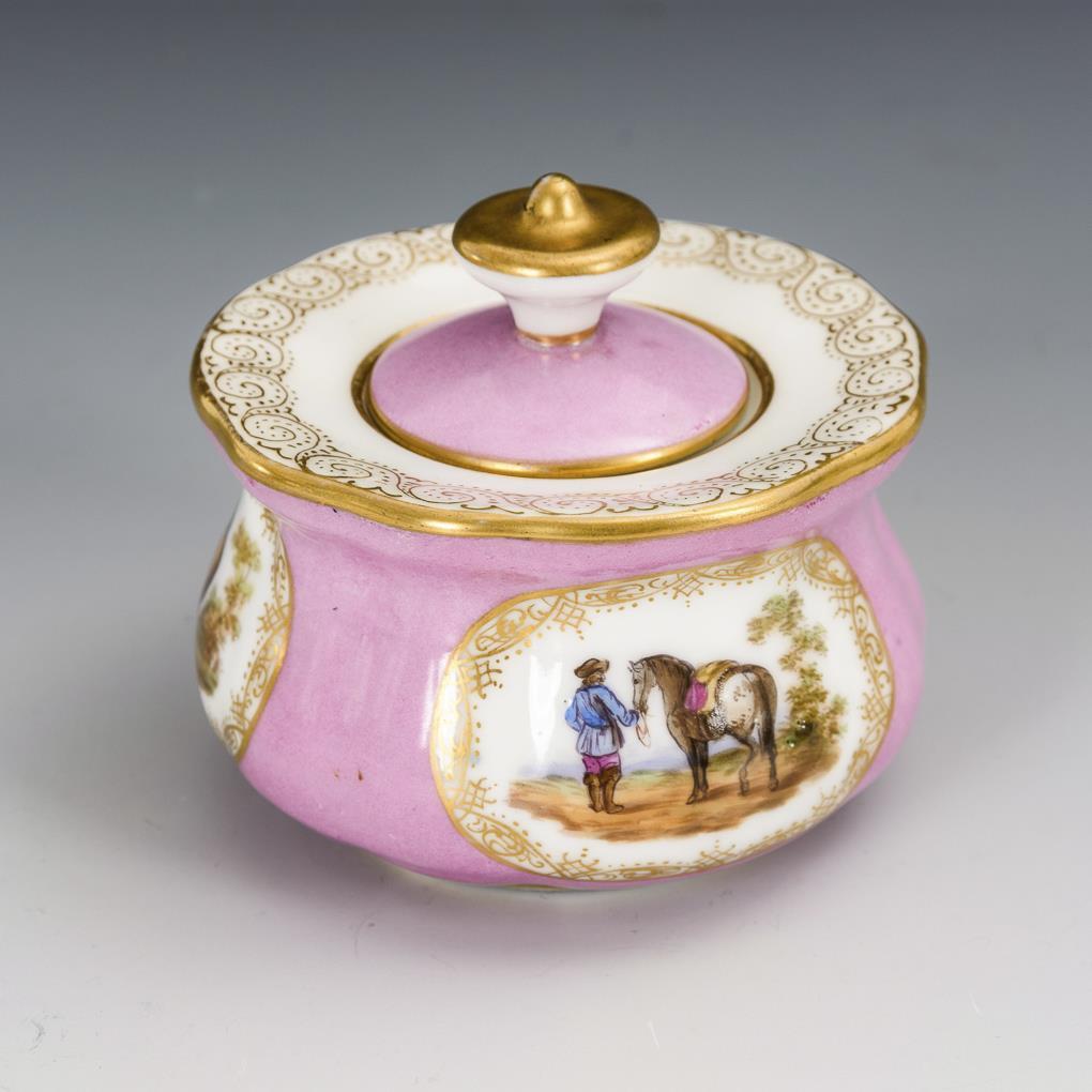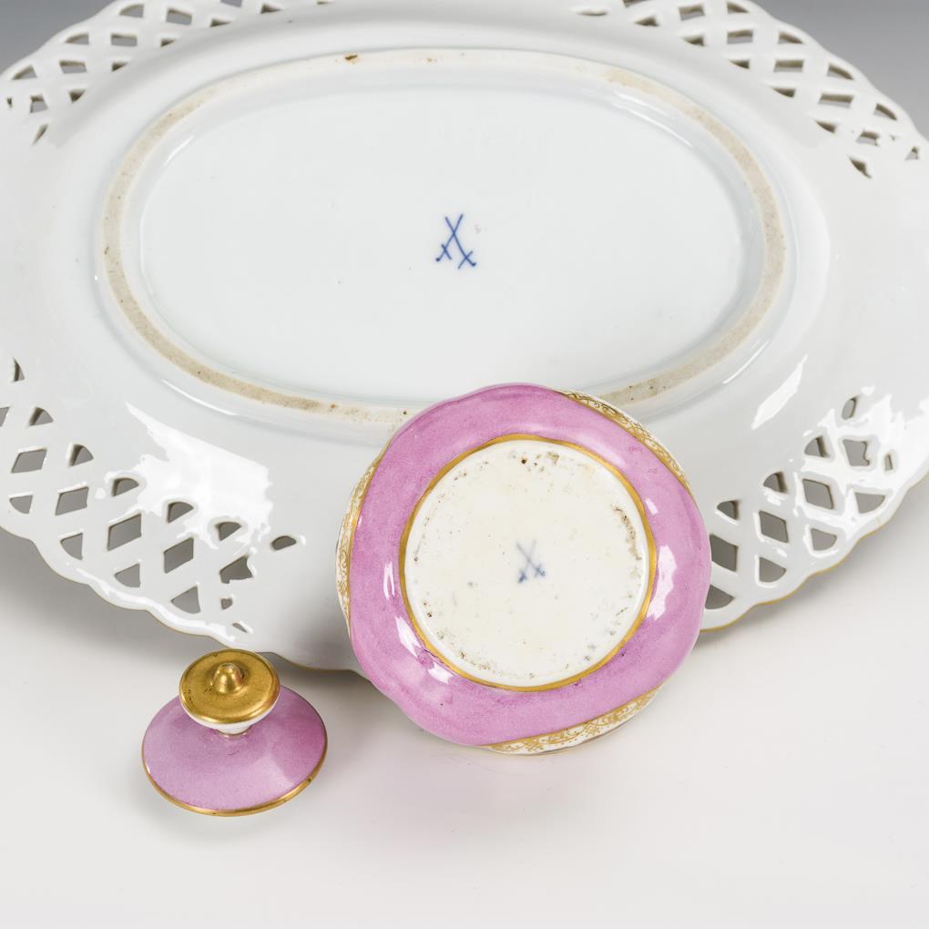 Ovales Presentoir mit gitterdurchbrochener Fahne (L 26,5 cm). / Tintenfass mit rosa Fond und Reiter-/Pferdemotiven in vier Ovalkartuschen (H 7 cm). Partieller Goldabrieb.
