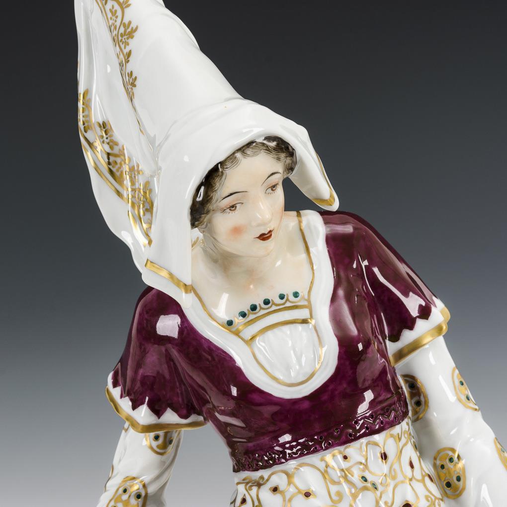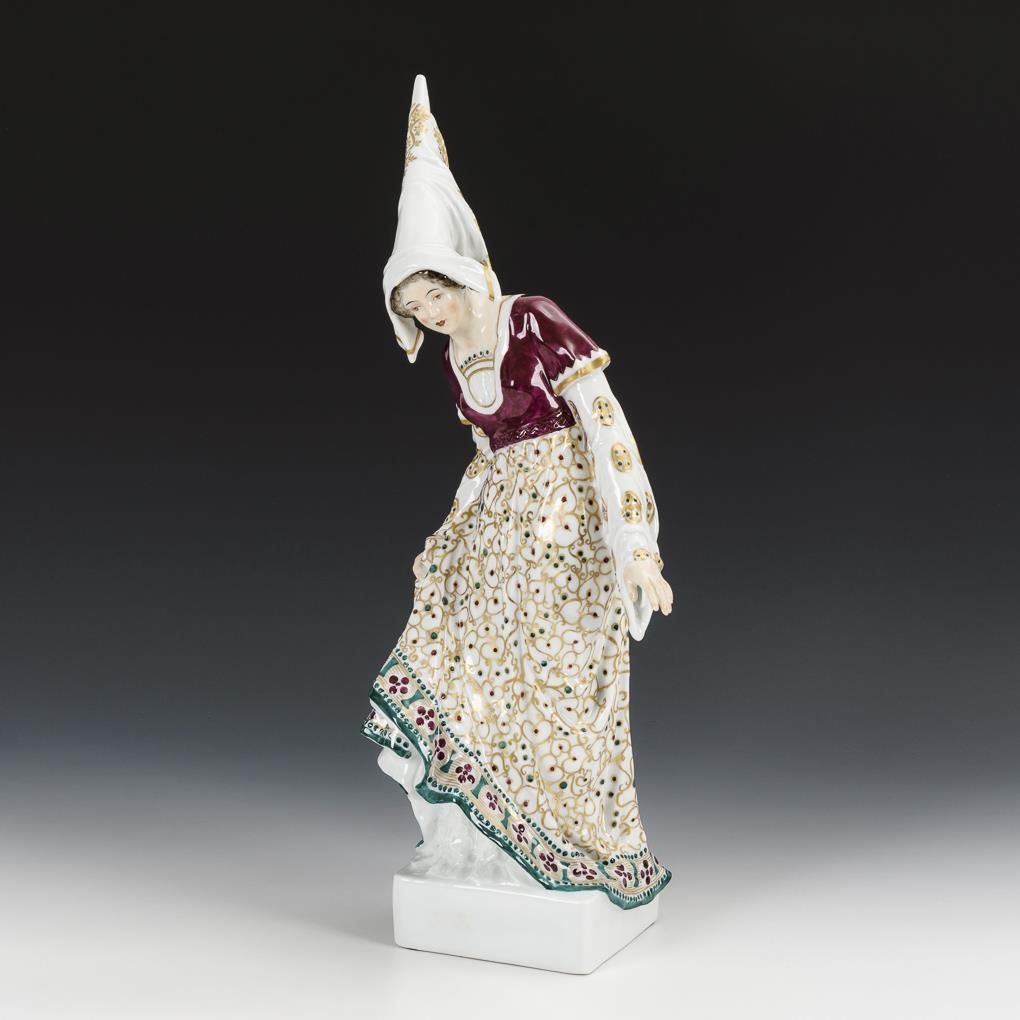 Elegante Figur einer jungen Frau in burgundischer Kleidung mit Hennin.