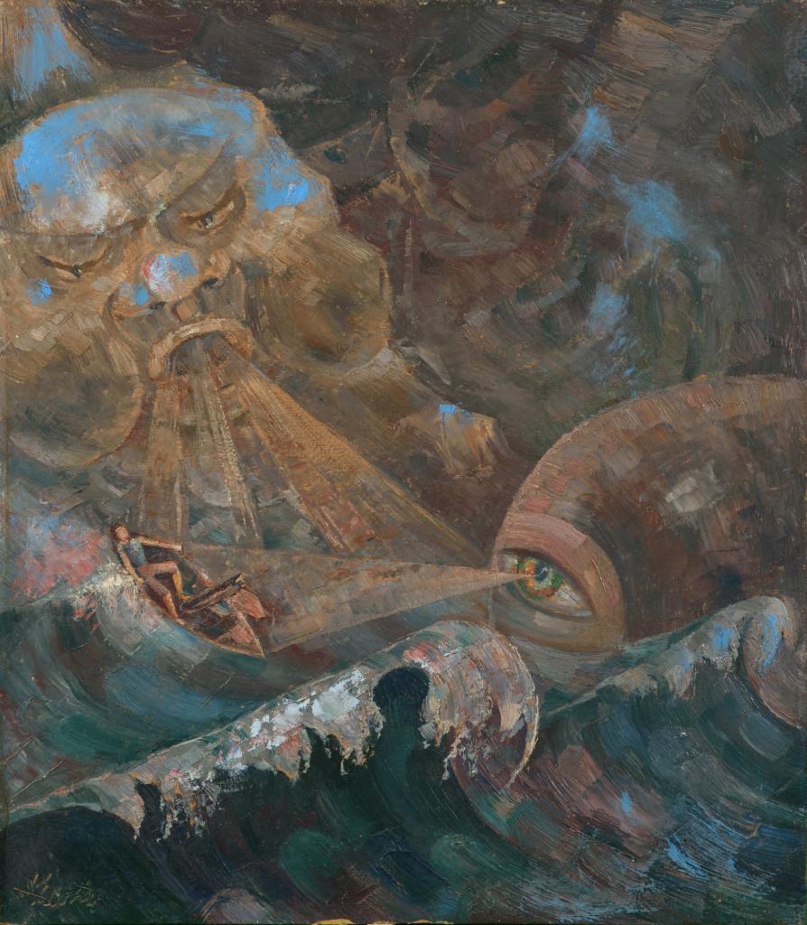 Surrealistische Szene mit Bootsfahrer auf hohen Wellen zwischen zwei Köpfen.