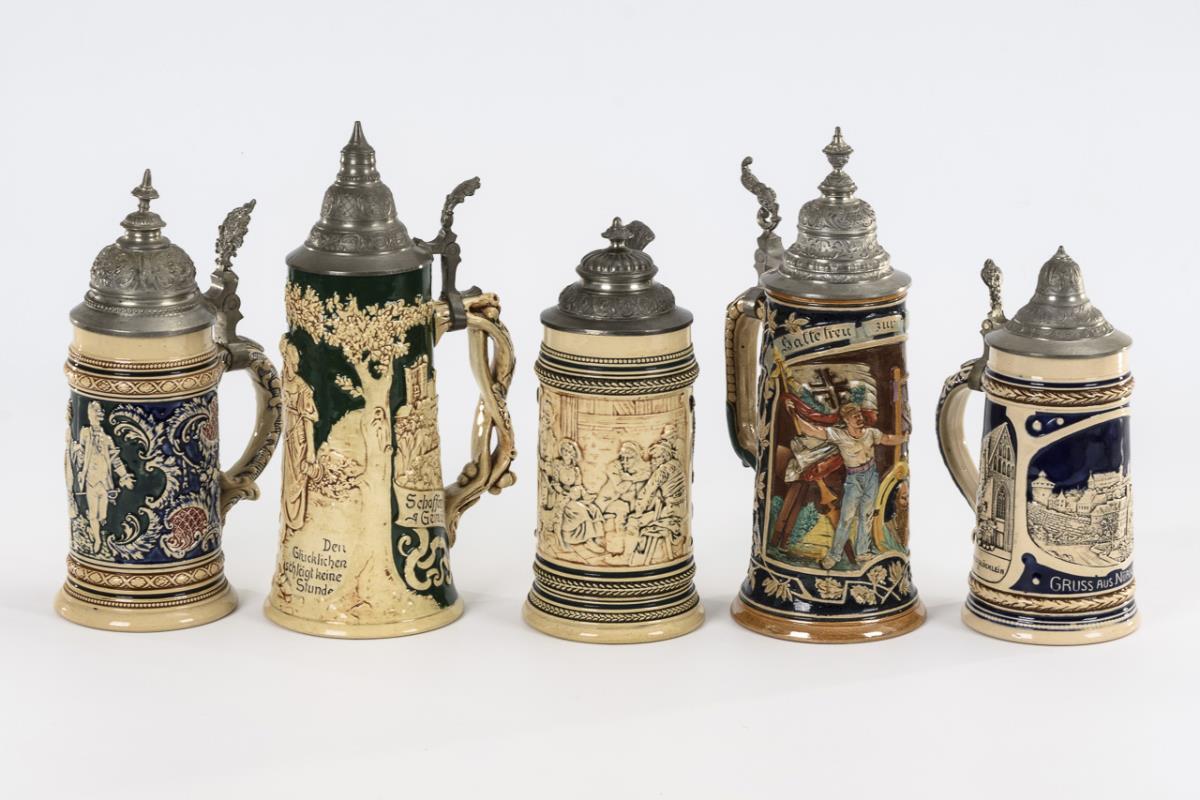 5 Gründerzeit-Reliefkrüge mit Fasson-Zinndeckeln.