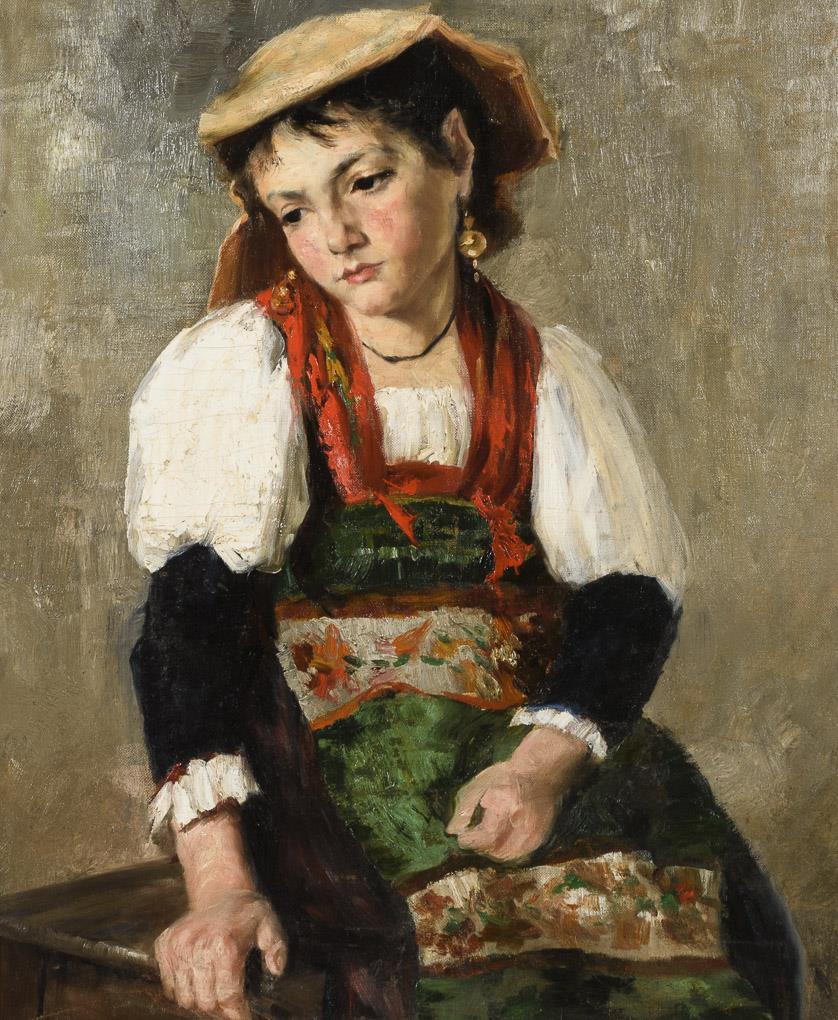 Porträt einer jungen Frau in Tracht, mit nachdenklichem Blick. Minimale Altersspuren.
