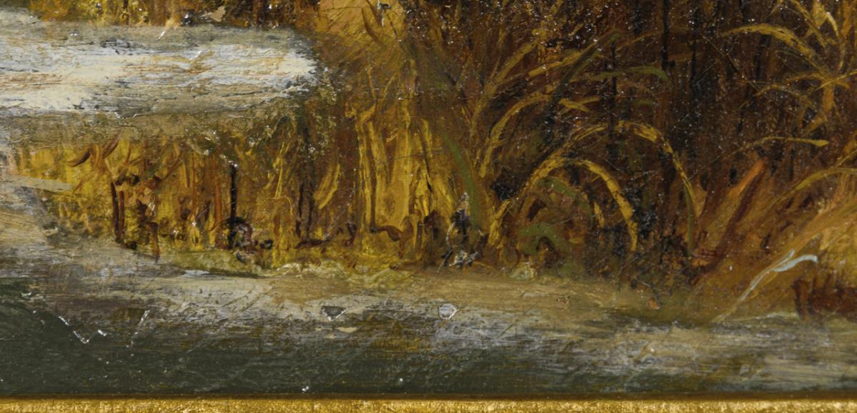 Staffagefiguren auf vereistem Fluss nahe einer Kirche an einem sonnigen Wintertag. Altersspuren.