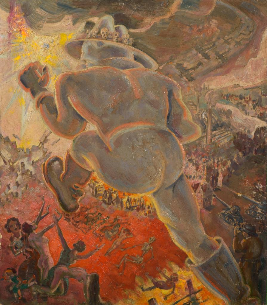 Übergroße und mit Gewalt voranschreitende Figur, unter den Füßen nur Tod und Leid.