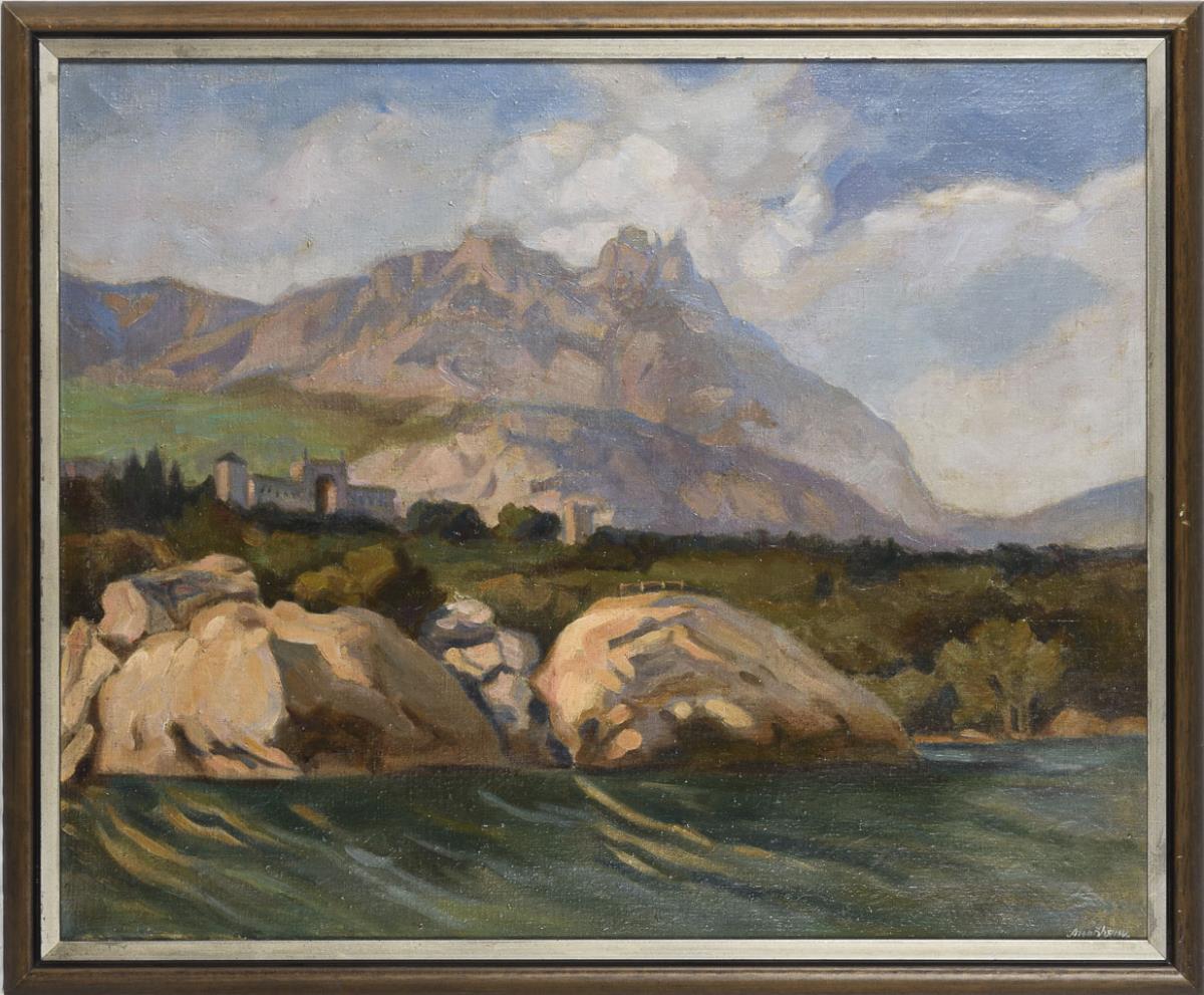 Helles Sonnenlicht über der Berglandschaft mit dem Kloster nahe dem Ufer. Eine kleine restaurierte Stelle mit Hinterklebung.