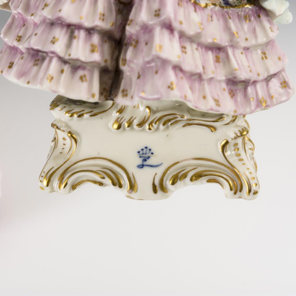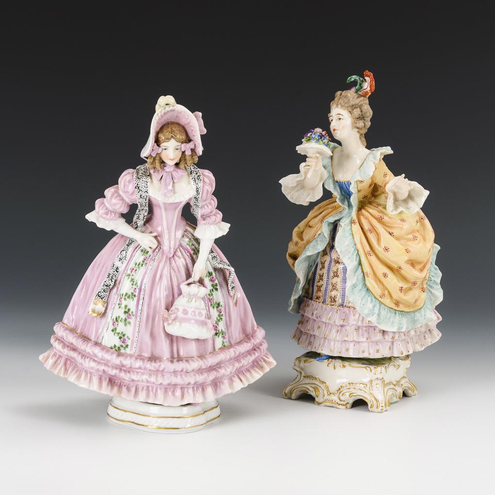 Rokokodame mit Blumenstrauß und Biedermeierdame mit Schutenhut. Verso Brandriss am Rock der Rokokodame, Hutschmuck und Hände der Biedermeierdame restauriert.