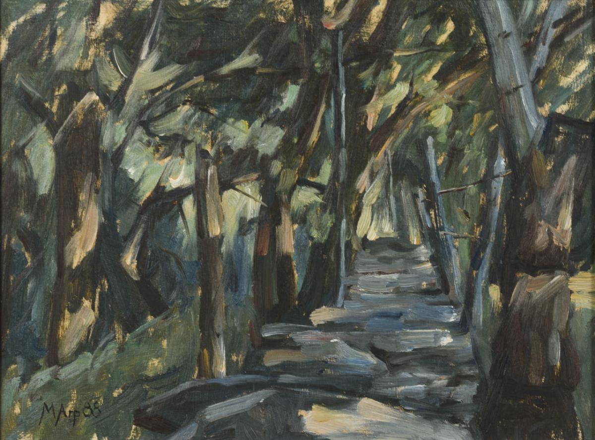 Expressive Darstellung eines Weges inmitten der Bäume bei Sonnenschein.