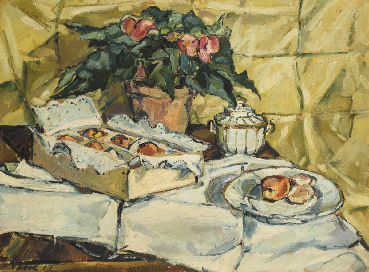 Apfelkiste neben Teller und Dose sowie einer blühenden Topfpflanze auf einem Tisch. Minimale Altersspuren.
