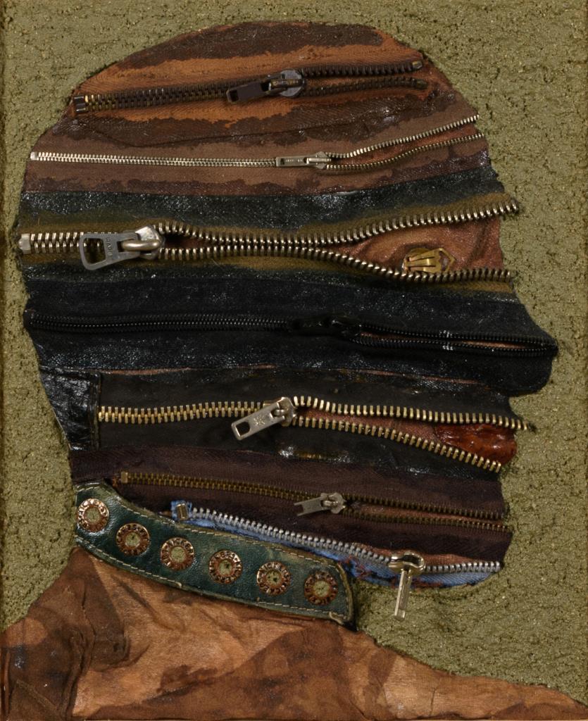 Collage aus Leder, Reißverschluss, Metallösen und -Knöpfen.Unsigniert, verso bezeichnet/betitelt.