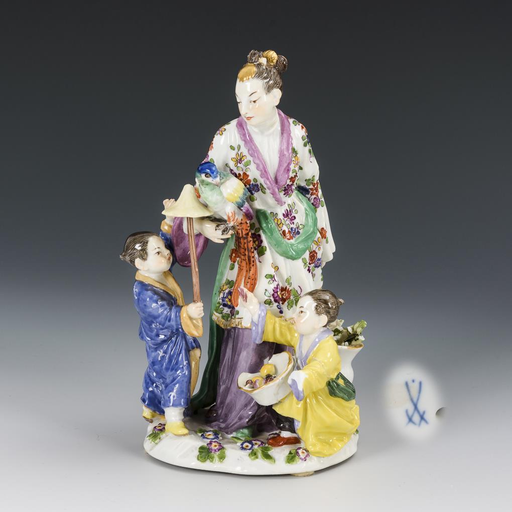 Stehende Japanerin mit Pfau auf dem Arm, an ihrer Seite ein Kind mit Schirm und ein Kind mit Früchteschale. 1 Kinderhand fehlt, 1 Kinderarm und Früchteschale geklebt, Blätter der Topfpflanze fehlen, Haarschmuck der Frau bestoßen.
