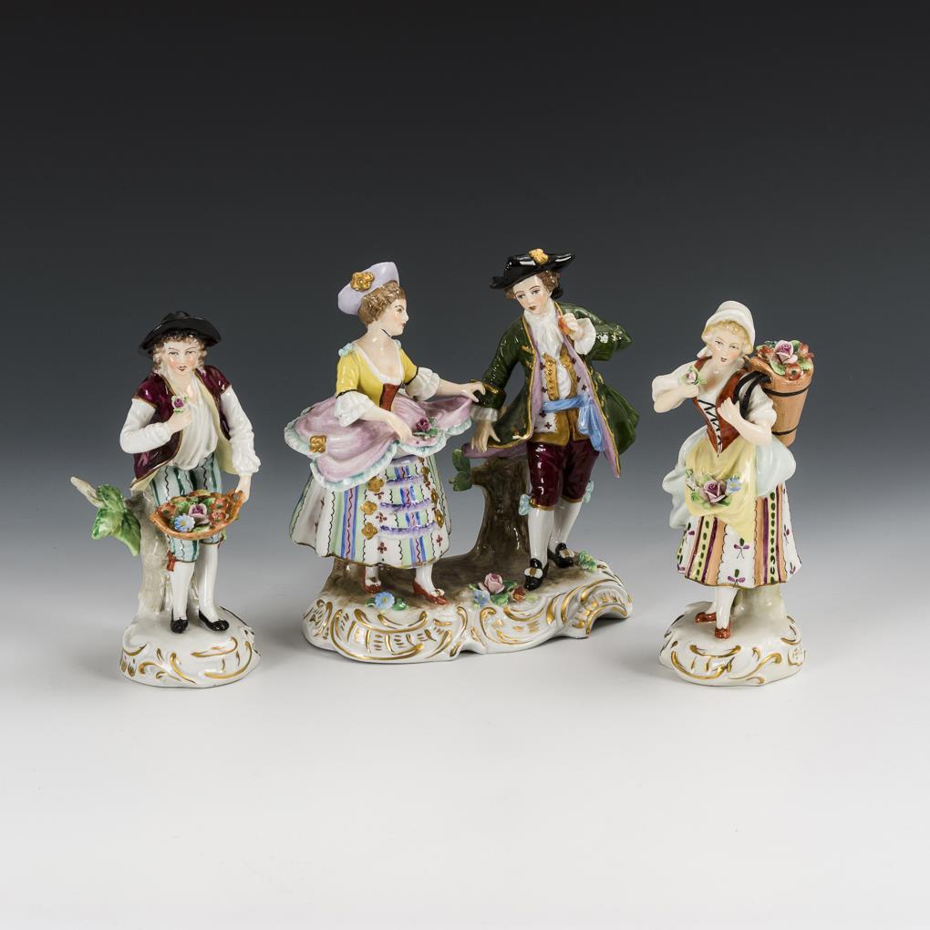 1x Rokokopaar auf Rocaillesockel. / 1x Gärtnerin mit Rosenkorb sowie als Pendant 1x Gärtner mit Blütenkorb. Rokokopaar: Bestoßung am Hut der Dame, beide Köpfe geklebt. / Gärtnerfiguren: 1 Blüte fehlt.